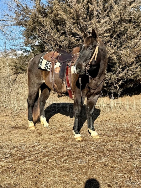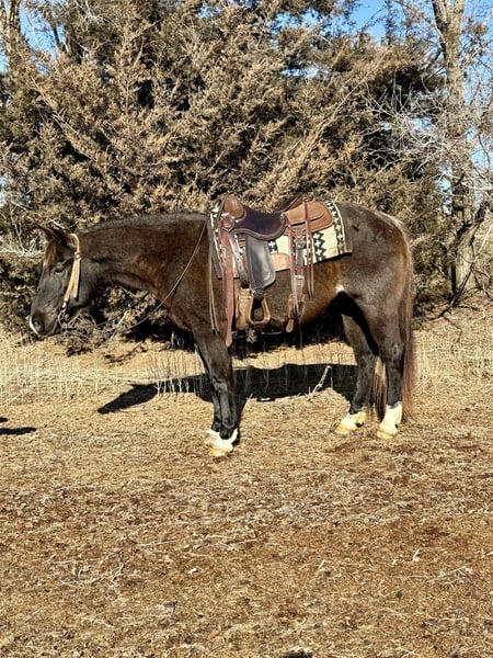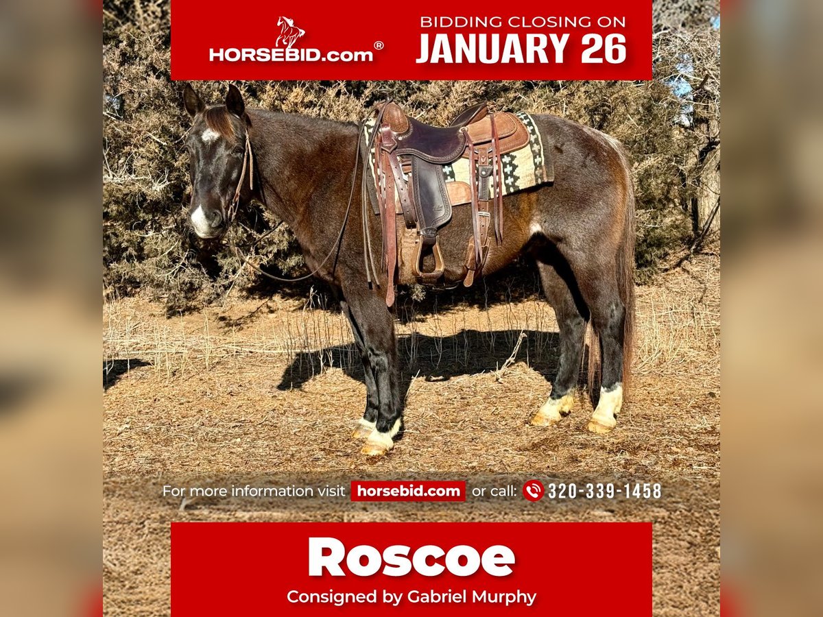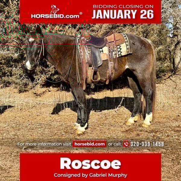 𝐉𝐀𝐍𝐔𝐀𝐑𝐘 ⭐️𝑨𝒍𝒍 𝑺𝒕𝒂𝒓 𝑳𝒊𝒏𝒆𝒖𝒑⭐️ Happening now thru MONDAY | JANUARY 26th - Available EXCLUSIVELY on HorseBid's website! For more details and to register visit: www.Horsebid.com CONSIGNOR CONTACT: Gabriel Murphy 320-339-1458 LOCATION: Cannon Falls, MN BREED: Quarter horse REGISTERED: No REGISTERED NAME: Roscoe COLOR: Blue roan HEIGHT: 14.3 AGE: 6 GENDER: Gelding Roscoe Roscoe is a 6-year-old grade blue roan gelding standing 14.3 hh. This cute, handy-sized gelding is super easy to ride with a calm, quiet demeanor both on the ground and under saddle. He truly has a been-there-done-that attitude. Roscoe has done a little bit of everything. He was started as a rope horse, used in mounted shooting, ridden English, and started over jumps. He’s been ridden extensively on the trails through brush and rough country, and he’s even been taken into town. No matter where you take him, he stays the same steady, willing horse. On the ground, Roscoe is a gentleman. He stands great for the farrier and picks up all four feet easily with just a touch of your hand. He’s very easy to bridle and unbridle, keeping his head low, and he ground ties so you can drop the reins and walk away. He truly is the sweetest little guy to be around. In the arena, Roscoe is well trained and responsive. He stands quietly to mount and dismount, has a soft neck rein, and will also ride direct rein. He moves nicely off leg pressure, side-passes both directions, and has a very slow, controlled walk that can cover ground without breaking into a trot. He offers a smooth jog, an extended trot, and clean lope departures, popping right into the correct lead when asked. His lope is slow and smooth. When you say “whoa,” he’ll sit down and stop hard, and he has a nice, correct rollback. Out on the trails, Roscoe is a pleasure to ride. He doesn’t spook at wildlife or unusual objects, crosses water and downfall with confidence, and handles steep hills with ease. He trailers well, loading and unloading quietly. We’ve ridden him around traffic in town, and he remains calm and dependable every time. Roscoe is up to date on all vet work and Coggins. He is currently barefoot and does not require shoes. Don’t miss out on this versatile, gentle gelding—he’s truly the kind of horse everyone is looking for.