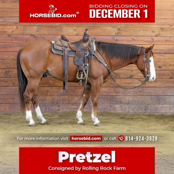 ⚜️ 𝓽𝓱𝓮 𝐇𝐨𝐫𝐬𝐞𝐦𝐚𝐧'𝐬 𝓢𝓱𝓸𝔀𝓬𝓪𝓼𝓮⚜️ Happening now thru MONDAY | DECEMBER 1st - Available EXCLUSIVELY on HorseBid's website! For more details and to register visit: www.Horsebid.com CONSIGNOR CONTACT: Rolling Rock Farm 814-924-3828 LOCATION: Miola PA BREED: Quarter horse REGISTERED: Yes REGISTERED NAME: YEP HEZA COOL GUN COLOR: Sorrel HEIGHT: 14.3 AGE: 5 GENDER: Gelding Pretzel is the kind of young gelding everyone is looking for sane, broke, versatile, and absolutely pleasant to be around. At just 5 years old, he already shows the maturity, willingness, and quiet mind of a much older horse. Standing 14.3 hands, he is a compact, sporty, well made gelding with great bone, a kind expression, and a sweet, people oriented disposition. With a foundation started in reining, Pretzel rides around beautifully in the arena. He is soft in the face, correct in his neck rein, and very responsive to leg and seat. He carries a headset at the trot, steps into both leads smoothly, and offers a comfortable, balanced lope. His stop is big and correct, and he willingly performs all his maneuvers without resistance. He is the same horse every ride quiet, consistent, and easy to operate whether you are tuning him up or just cruising around on a loose rein. Pretzel is also very confident with all kinds of obstacles and tasks. He will carry the American flag without hesitation, you can rope off him, drag objects, and handle tarps, slickers, and noisy equipment all around his body. He takes everything you throw at him with ease. Making him a great candidate for ranch riding, versatility, mounted patrol, obstacle events, or simply a reliable all around partner. On the trail, he is just as solid. Pretzel walks out calmly and willingly, staying relaxed and focused no matter where he goes. Brush, water, mud, wildlife, traffic, dogs, nothing bothers him. He goes through water and thick brush without hesitation and is happy to lead, follow, or ride out alone. His steady and unflappable temperament makes him a joy for riders who want to feel safe and confident whether on the trail or exploring new environments. On the ground, Pretzel is a complete gentleman. He stands perfectly to be saddled, bathed, blanketed, trimmed, and brushed, and he genuinely enjoys attention. He is easy to catch in the pasture, always meets you at the gate, and is low in the pecking order which makes him easy to turn out with others. He is comfortable whether he is stalled or living outside, and adjusts easily to any routine. Pretzel is fully up to date on routine care. He has a current negative Coggins, recent deworming, a rabies vaccine, and he recently underwent a full health and lameness evaluation on November 17, 2025. Pretzel is the rare combination of young, well trained, gentle, and uncomplicated. He has the foundation, talent, and mind to go in any direction whether you want a reliable family horse, a performance prospect, a steady trail partner, or a versatile all around gelding with a truly exceptional temperament. He is the kind of horse that makes every day enjoyable and he has his entire future ahead of him. If you would like to check out Pretzel or have any questions please feel free to contact Ethan at (814) 924-3828