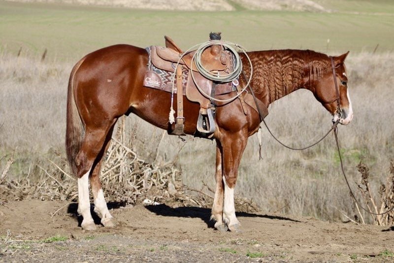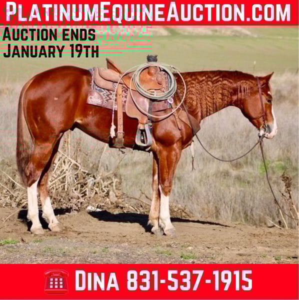 ONLINE AUCTION Place your bids at www.PlatinumEquineAuction.com Starting Bid $3500 Auction ends January 19th, 2025 Need a new saddle? Check out White Rock Saddles on our website or Facebook! If you’ve been on the lookout for that perfect heart horse, let me tell you, your search ends here with Berlin! This gorgeous AQHA gelding is the total package, and I can’t recommend him enough! Standing just over 15 hands tall, this 2020 gem is not only stunning but comes from an incredible lineage featuring legends like Smart Little Lena and Hollywood Heat. Seriously, he’s a total showstopper with his high white socks and that adorable belly spot, but what really melts your heart is his sweet and gentle personality. He’s the kind of horse that just wants to be your best friend, making him ideal for riders at any skill level. You’ll be amazed at how effortlessly he picks up leads and executes impressive turns—he can even spin without you needing to lift a finger! His sliding stops are just so smooth, and he carries himself with such grace. On the trails, he’s an absolute superstar, confidently navigating through water and logs, completely unbothered by wildlife. Whether you’re gathering cows or just enjoying a leisurely ride around town cars buses and semis are a peace of cake. Berlin stays calm and collected, no matter what comes his way. He’s tackled everything from bridges, tarps,flags and flying balls swinging over is head and he just stands there calm as a cucumber. He will go over any obstacle you ask with such poise, and when it’s grooming time, he’s an absolute champ, standing patiently for baths and tacking up. Plus, he’s fantastic for farriers, whether he’s in a stall or out in the pasture. He goes out alone or with friends. Berlin handles time off well and Retains his training. If you’re searching for a beautiful, trustworthy companion who’s as versatile as they come, you absolutely need to check out Berlin at Longhorn Ranch in Paicines, CA. Trust me, you won’t regret it—contact Dina at 1831-537-1915 and get ready to meet your new best buddy! ONLINE AUCTION Place your bids at www.PlatinumEquineAuction.com Starting Bid $3500 Auction ends January 19th, 2025 Need a new saddle? Check out White Rock Saddles on our website or Facebook!