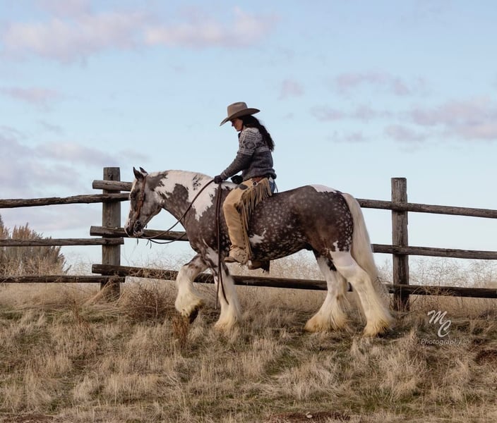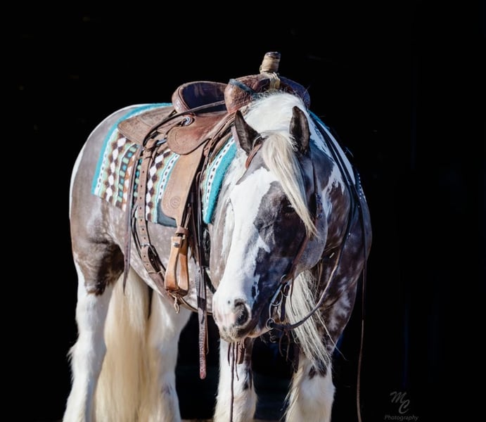 ONLINE AUCTION Place your bids at www.PlatinumEquineAuction.com Starting Bid $3500 Auction ends March 23rd, 2025 Need a new saddle? Check out White Rock Saddles on our website or Facebook! ASHL Deuteronomous Cupid is a registered, 2020 model, Gypsy Vanner, Gelding, that is standing around 15HH and he is a RARE Silver Dapple Paint color!!! Cupid just like his name would suggest he will steal your heart. I’ve been blessed to own and ride some incredible Gypsy’s and Cupid is definitely at the top of the list. He is amazing! Calm, cool customer in any situation who absolutely adores the attention you give him. His heart will melt yours with his kind disposition. Cupid is broke the very best whether you’re in the arena out on the ranch or riding down Main Street he’s done it and will please. Cupid handles around like a broke horse should he’s soft in his face and sides without being overreactive or jumpy. He’s EASY and uncomplicated with a good neck rein, stops on a dime, and will turn around nicely. Will side pass both ways and pick up his leads from a standstill. His lope is smooth to ride all day. He will collect and has been under English tack as well. Cupid is trained to lay down with a tap on the shoulder he’s very simple to cue and our kids love to lay him down for mounting and dismounting. He is 1000% safe and honest. From little kids to great grandpa everyone can ride him no matter what the task is. This is the kindest horses you will ever meet. Cupid will make you smile every day you own him and is definitely a family favorite of ours. Located in Wickenburg, AZ. For more info contact J Arrow Livestock Jerry 208-550-0992. ONLINE AUCTION Place your bids at www.PlatinumEquineAuction.com Starting Bid $3500 Auction ends March 23rd, 2025 Need a new saddle? Check out White Rock Saddles on our website or Facebook!