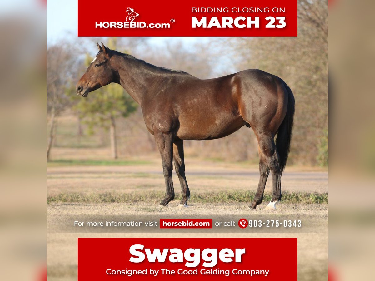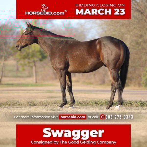 ⚜️𝓽𝓱𝓮 𝐆𝐎𝐋𝐃 𝓢𝓮𝓵𝓮𝓬𝓽⚜️ Happening now thru MONDAY | MARCH 23rd - Available EXCLUSIVELY on HorseBid's website! For more details and to register visit: www.Horsebid.com CONSIGNOR CONTACT: The Good Gelding Company 903-275-0343 LOCATION: Athens, TX BREED: Appendix REGISTERED: Yes REGISTERED NAME: GGC Swagger COLOR: Bay HEIGHT: 15.2 AGE: 6 GENDER: Gelding Swagger is a handsome 6-year-old dark bay Appendix gelding standing 15.2 hands with a great mind and an easygoing personality. He is the type of horse that is enjoyable to have around and willing to do whatever you ask of him. Swagger rides both English and western and has been lightly exposed to a variety of things. He trots the barrel pattern, comfortably trots ground poles and cross rails, and has proven to be a fun and willing partner no matter what tack you throw on him. He has also been trail ridden extensively, confidently crossing water and navigating obstacles out on the trail. He is the kind of horse you can enjoy in many different ways. Swagger is comfortable riding bareback, has excellent ground manners, and truly enjoys being around people. He is easy to handle, polite on the ground, and pleasant to work with. Swagger is currently barefoot and doing well that way. He would make a wonderful partner for someone looking for a versatile horse to enjoy trails, arena riding, or continue developing in multiple disciplines. Swagger is a kind, willing gelding with a great attitude and the potential to continue going in many directions.
