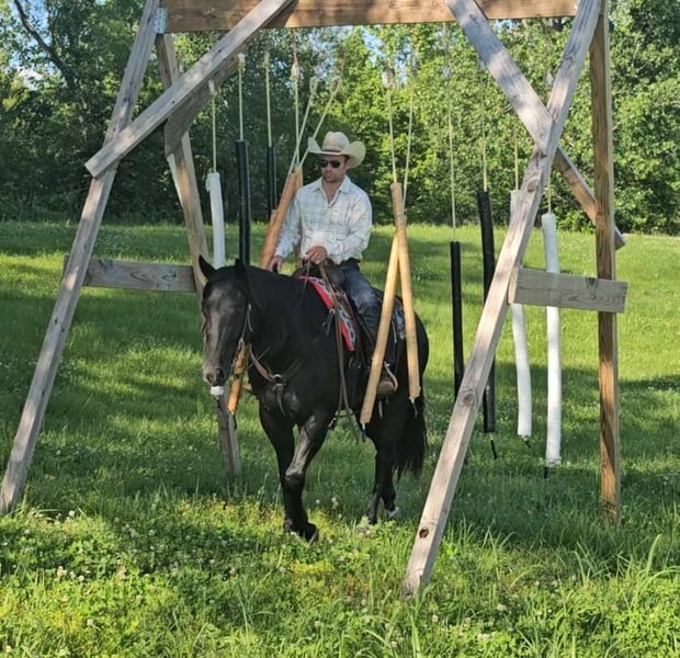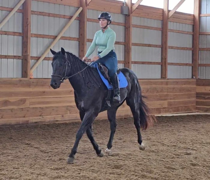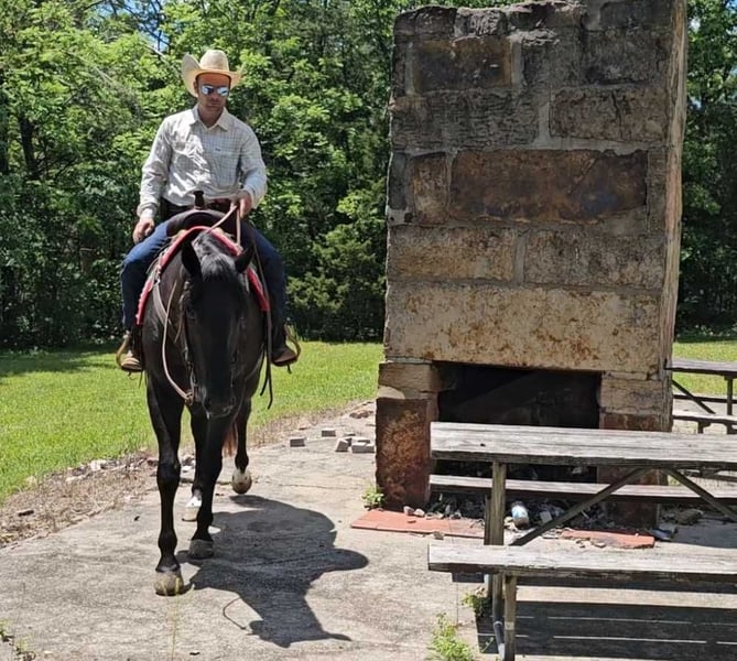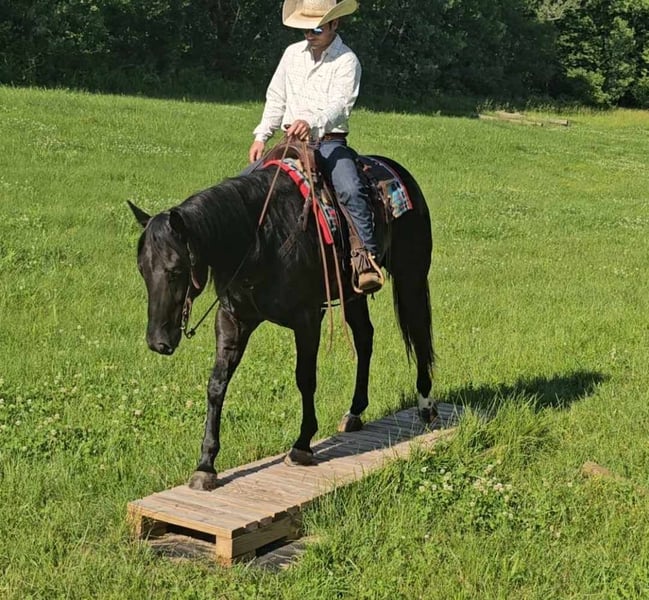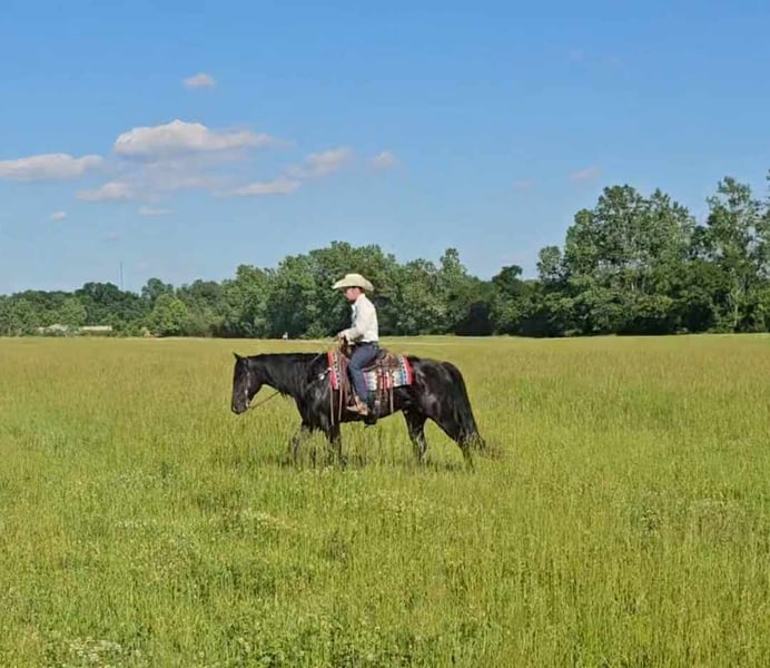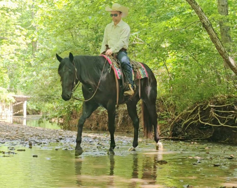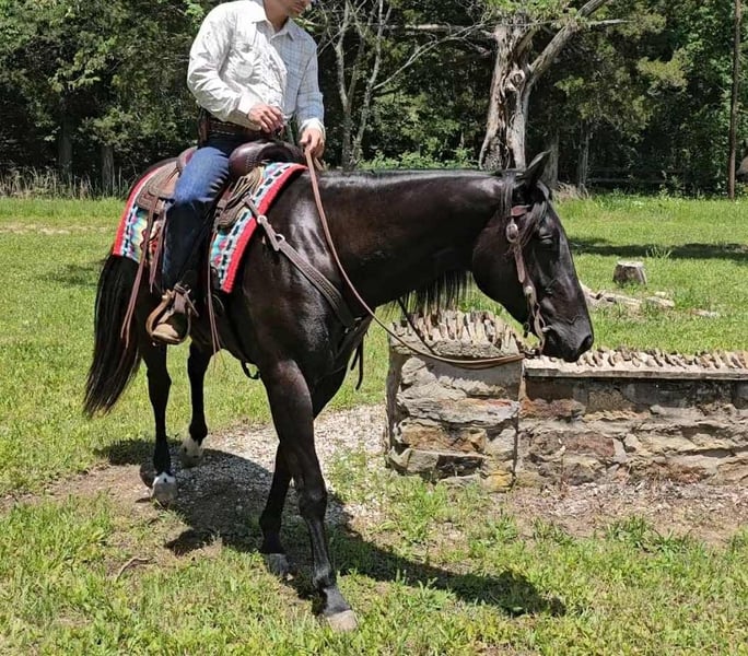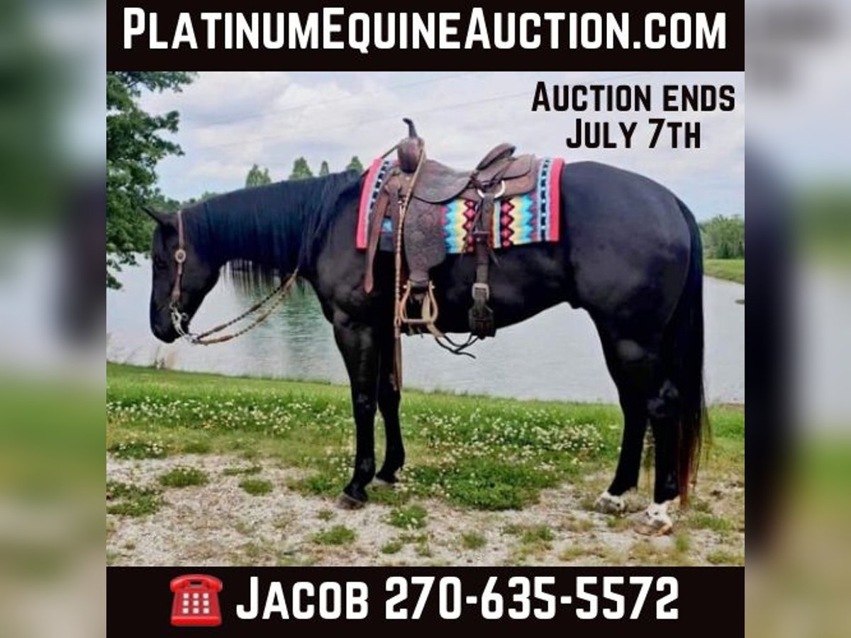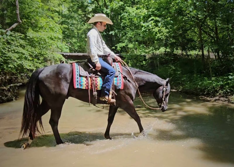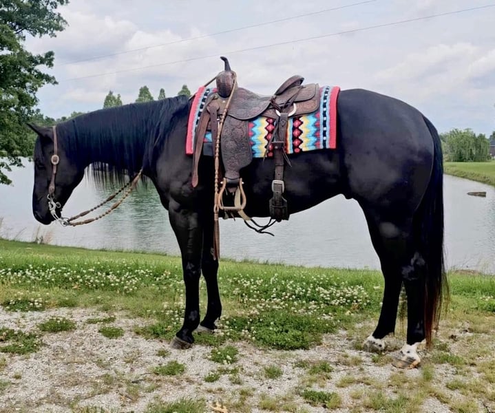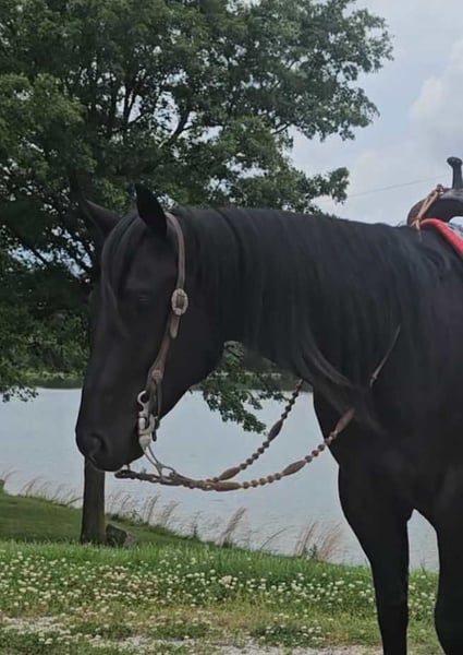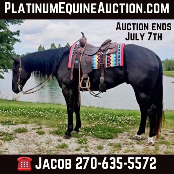 ONLINE AUCTION Place your bids at www.PlatinumEquineAuction.com Starting Bid $3500 Auction ends July 7th, 2024 Need a new saddle? Check out White Rock Saddles on our website or Facebook! Bill is a 4 year old, registered AQHA 15.2hh, gelding. He is a stunning black color with a long beautiful mane & tail!! Bill has the sweetest personality that you will fall in love with. Don’t let his age fool you, there is no funny business with this guy. Bill is always looking to please. Bill has spent most of his days out in the woods & trail riding. He will works gates, gets his leads, side passes, & has a great start to his turn arounds. You couldn’t ask for one to be started any better then this guy. He’s seen all kinds of wildlife life and spent many miles in the fields and woods. He will do all the trail obstacles with no hesitation and is an absolute blast to ride. Bill has been through our desensitizing program; traffic, traps, dogs, do not phase him. He will even ride english. Bill, would also be great for a intermediate youth or adult rider wanting to get into all the events in 4-H, sorting, ARHA, roping, or just a safe dependable trail horse. Bill has the best ground manners, is easy to catch in the field, and gets along with other horses. He stands for saddling, bathing, clipping, and for the farrier. He currently shod on the front, but would easily go barefoot foot. Bill sells 100% sound and up to date on vaccinations. Located in Robards, KY. Contact Jacob Littlepage 270-635-5572. ONLINE AUCTION Place your bids at www.PlatinumEquineAuction.com Starting Bid $3500 Auction ends July 7th, 2024 Need a new saddle? Check out White Rock Saddles on our website or Facebook!