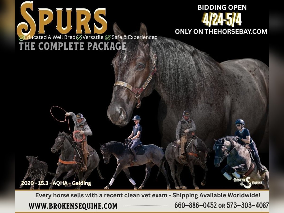 If you’re looking for the kind of horse that mixes talent and looks, all while taking care of his rider, this is him. Honest, forgiving, and incredibly intuitive, he’s the definition of amateur friendly. He is confidence building for riders of all levels and the same steady partner every single day. He doesn’t just excel in one lane; he’s the rare type that can step into the show ring, quietly pack someone around in English or western, or go put in a solid day’s work on the ranch without missing a beat. Versatile, dependable, and safe in every sense of the word, he’s the kind you can trust to do it all—and do it well, any day, in any place. Spurs is a 2020 Quarter Horse gelding standing 15.3 hands tall. He is what dreams are made of. There is nothing this horse cannot do. He makes whoever climbs on his back look, and feel, like a pro. You feel pure joy every time you climb into his saddle. He is steady, deliberate, and has all of the buttons without being reactive. Everything about this horse is right—His looks, his brain, and his education. He has been a barn favorite, and I’m not sure we will ever have another quite as special as him. Under western tack, Spurs has been used extensively outside — doctoring cattle, sorting, and gathering pastures. He knows a day’s work and handles cattle with confidence. He will rope both ends, is stout to the horn, and has a ton of cow. Spurs was started on the Barrel pattern and did 90 days in a barrel program. Spurs circles well, has great lead departures, powerful spins, and a big stop. He knows all of the maneuvers and can go in any direction and be successful. Under English tack, Spurs is a dream. Seamlessly put together dressage tests, jump around courses in the ring, or hit the cross country field. He is smooth, comfortable, and easy to ride. His gaits are adjustable, he is soft in the bridle, and his brain is unbeatable. Anything you ask of him, he does well. He’s the ideal amateur horse as he is kind, forgiving, and always building confidence. On the trails and off property, Spurs is a professional. He is safe, sure footed, and reliable wherever you take him. From camping trips, off property trips to school and train, trail rides, and trips to town, Spurs has proven to go into any place or situation calmly and like he’s been there a thousand times before. He crosses water, swims, is safe in busy traffic, and crosses any obstacle you point him at. He will ride happily alone, or in a group. He’s great to trailer and is easy to load and travel with. In the barn, Spurs is a great horse to be around. He is a good boy for all the usual barn tasks and genuinely enjoys being around his people. He’s happy living inside or out and is an easy keeper. Spurs has a kind and gentle personality that everyone loves. He’s respectful, personable, and a joy to have in the barn. ⚫️Spurs is an easy keeper that requires no maintenance.