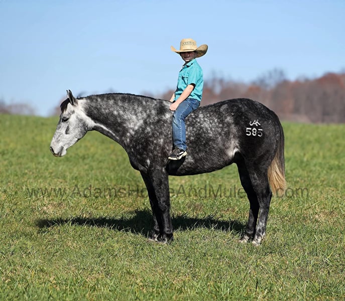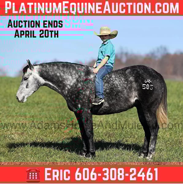 ONLINE AUCTION Place your bids at www.PlatinumEquineAuction.com Starting Bid $3500 Auction ends April 20th, 2025 Need a new saddle? Check out White Rock Saddles on our website or Facebook! AJak Mr Val Star 585 aka Val is a beautiful Dapple Grey that is very stout built, standing 14.3hh and he is a 2019 Model Registered AQHA Gelding! We have had a lot of these “Jak” horses that are bred and raised on the Oleen Brothers Ranch out in Kansas and every one of them that we have had are always gentle, good minded horses that are great for trails and ranch work. Val is no exception to that trend! He is a gentle type of horse that is never in a hurry! He lopes nice circles, catches the correct leads, has a good stop and reins around. Val just eases along down the trail and loves going on trail rides. He will cross creeks, ditches, logs and navigate rough rocky areas. Val has been exposed to all kinds of wildlife and will go anywhere that he is asked too. He has been rode many miles in the mountains and encountered every obstacle possible on the trail. He will go up or down even the steepest slopes, across deep creeks, over downed trees, and over all types of rough terrain while still being sure footed. Val has been ridden down the highways and is traffic safe as well. Val has been used around the ranch, he has sorted, penned and pasture roped. If you need a broke, quiet, gentle, safe horse for ranch or trails… Val is your guy! Call Adams Horse & Mule Co. Eric 606-308-2461 with any questions or to make a Buy It Now Offer. Located in Mt. Vernon, KY. ONLINE AUCTION Place your bids at www.PlatinumEquineAuction.com Starting Bid $3500 Auction ends April 20th, 2025 Need a new saddle? Check out White Rock Saddles on our website or Facebook!