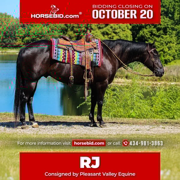 ♦️ 𝐭𝐡𝐞 𝐀𝐌𝐄𝐑𝐈𝐂𝐀𝐍 𝓕𝓪𝓵𝓵 𝓒𝓵𝓪𝓼𝓼𝓲𝓬 ♦️ Happening now thru MONDAY | OCTOBER 20th - Available EXCLUSIVELY on HorseBid's website! For more details and to register visit: www.Horsebid.com CONSIGNOR CONTACT: Pleasant Valley Equine 434-981-3863 LOCATION: Robards, KY BREED: Quarter Horse REGISTERED: Yes REGISTERED NAME: Joes Last Tiger COLOR: Black HEIGHT: 14.3 AGE: 6 GENDER: Gelding R.J. will absolutely take your breath away with his beautiful BLACK color & perfect confirmation. R.J stands 14.3 hands and weighs 1300lbs. This 6 year is the perfect trail riding partner. R.J. has had one owner his entire life and lived just 30 minutes down the road. He is looking for a new home at no fault of his own. His previous owner has had some health issues needed to sell. R.J. has been rode all over the country in big groups, small groups, with wagons, and been on many overnight camping trips. He has packed saddle bags thousand of miles and he is trained to stand with hobbles or stay on a picket line overnight. He will ride out alone and away from the barn and be dependable. He will cross big bodies of water, steep/slippery banks, cross logs, go through mud, and traffic safe. R.J. is very well mannered on the ground and he knows all of the ground work exercises. He even will do some liberty work. R.J. rides very well in the arena. His walk, trot, canter is like floating on a cloud. He has correct turnarounds, side passes, moves his hindend and fore quarters with ease. He has a one hand neck rein or he will ride two handed whichever you prefer. R.J. absolutely loves a spa day. He will literally stand quite as a church mouse to be groomed for hours. He stands great for the farrier, fly spray, & baths. R.J. enjoys the obstacle course. The tarps, umbrellas, bridges and bull whips don't not phase him. He will load on any kind of trailer with or without a ramp. R.J. also makes mounting simple. He will side pass over to a log, mounting block, or picknick table with just a snap of your fingers. If you're looking for a handsome and charming life partner with a head full of sense. R.J. is your man. R.J. sells. 100% sound in every way. Don't miss your chance to own this handsome gelding. R.J. has radiographs and a certicate of soundness from a licensed veterinarian. He's UTD on vaccinations and dental. Buy with total confidence. Call today to set up an appointment to meet R.J. 434-981-3863