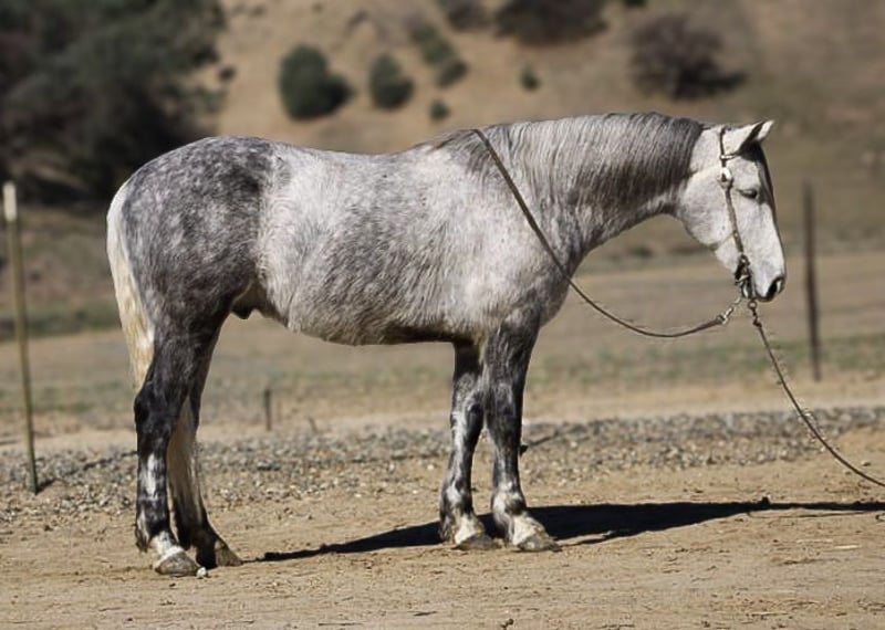 ONLINE AUCTION Place your bids at www.PlatinumEquineAuction.com Starting Bid $3500 Auction ends March 16th, 2025 Need a new saddle? Check out White Rock Saddles on our website or Facebook! Cosmo is a stunning dapple grey draft cross that is waiting to become your new best friend. At 6 years old, standing at 15 hands with a big thick bone and solid foot, he has the perfect combination of beauty and build. It’s impossible not to fall in love with this sweet boy. One of Cosmo’s strongest qualities is his ability to be an excellent trail partner. He navigates any terrain with ease and is sure-footed on even the most challenging trails. Ditches, brush, and wildlife are all just a part of his routine. You can trust him to take you safely up or down any trail without hesitation. In the arena, he has a comfortable trot, smooth lope, and a picture-perfect sliding stop. He has also been introduced to trail obstacles and he confidently tackles bridges, tires, and even walking through a car wash. We have also taken Cosmo out to gather cattle and check pastures. He takes each outing in stride and seems to truly enjoy every adventure we take him on. This friendly horse will meet you at the gate with excitement and loves nothing more than getting pampered especially with belly scratches. Cosmo is an absolute pleasure to handle as well. He stands patiently for clipping and bathing, ties quietly, loads easily into trailers, and hauls like a pro. We have even ridden him down busy streets where he didn’t bat an eye at passing cars or trucks. With his pretty movement, Cosmo would look stunning in English tack too. Whether you’re looking for a reliable trail horse or one that excels in different riding disciplines, this boy is truly versatile. If you want an easy-going horse that anyone can ride, then Cosmo is definitely the rare find you’ve been searching for. He thrives in both pasture settings or stalls; it doesn’t matter to Cosmo as long as he has a loving home. If you’re ready for lifelong adventures with your next equine partner, then Cosmo is the perfect match for you. Please contact us at Longhorn Ranch and ask for Dina at 831-537-1915. We are located in Paicines, California, and would be more than happy to introduce you to this incredible horse. ONLINE AUCTION Place your bids at www.PlatinumEquineAuction.com Starting Bid $3500 Auction ends March 16th, 2025 Need a new saddle? Check out White Rock Saddles on our website or Facebook!