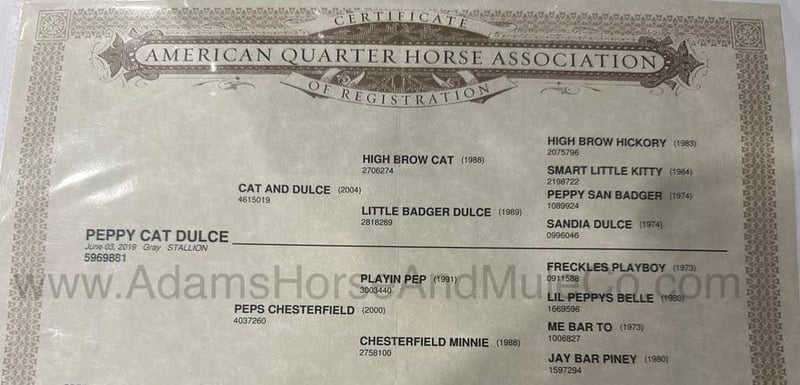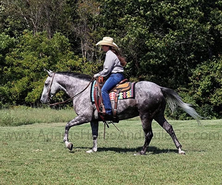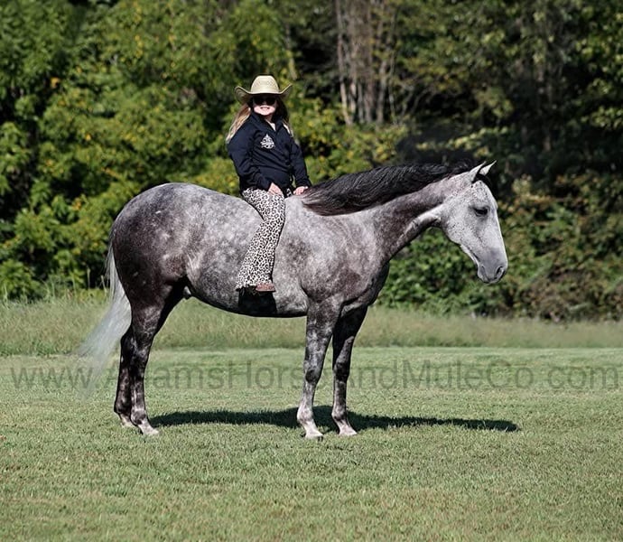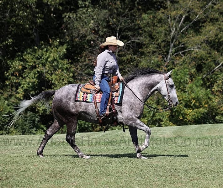 Mercedes is consigned to the Cowgirls Cadillacs sale in Wickenburg, AZ on February 21-22, 2025. Make plans to attend, you can bid in person or bid online. You can preview any horse in Mt. Vernon, KY before they head to Wickenburg, AZ or preview them when they arrive at the sale. Shipping can be arranged to any state or Canada. You can get more info about the sale at www.CowgirlCadillacs.com THESE Horses ARE NOT AVALAIBLE FOR PRIVATE PURCHASE Get your clipboard out and sharpen your pencil, ALL of those boxes are gonna get checked when you see Peppy Cat Dulce aka Mercedes… standing 15H tall and just about as wide, Mercedes is a 2019 model Reg AQHA, gelding with dapples from head to toe! Not only does he check that box in the looks department, take a look at his pedigree as he is a grandson of High Brow Cat with his dam going back to Colonel Freckles. Mercedes is bred to ride and bred to be a cow horse! He has had reining training and has worked the flag. He has been used out on the ranch for pasture roping and doctoring. Mercedes has team sorted and has been roped on out of the box. He lopes slow and easy in nice circles, spins both ways, slide stops… he has the moves to go along with the good looks! If the ranch work is done and you just want to go for a relaxing trail ride… steep slopes, rocky terrain, creeks, logs, ditches… he crosses it all with ease and is never in a hurry! If you have a free Saturday and want to go show him, he will excel in the Ranch Classes as well! Mercedes is the horse that can do any job, ride anywhere, the whole family can ride him and the whole family will love! Looks, Pedigree, Training, Experience, Versatility, Safe… he truly checks ALL the boxes!!! Call 606-308-2461 for more info.