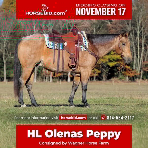 🎲𝓽𝓱𝓮 𝐑𝐈𝐃𝐄𝐑'𝐒 𝓒𝓱𝓸𝓲𝓬𝓮🎲 Happening now thru MONDAY | NOVEMBER 17th - Available EXCLUSIVELY on HorseBid's website! For more details and to register visit: www.Horsebid.com CONSIGNOR CONTACT: Wagner Horse Farm 814-564-2117 LOCATION: Clarion, Pa BREED: QH REGISTERED: Yes REGISTERED NAME: HL Olenas Peppy COLOR: Buckskin Roan HEIGHT: 15 AGE: 6 GENDER: Gelding HL Olenas Peppy is a 6 Year Old Buckskin Quarter Horse Gelding. He stands 15 hands tall and has a nice stocky built to him. He is a very good looking horse with a unique buckskin color with roaning throughout his body. Here is a super nice gelding in the prime of his life! Can do any job on the ranch , can be ridden by beginners in the arena and is great on the trail making him the whole complete package! He has had professional training and has a nice one hand neck rein, side pass, good head set, smooth trot and lopes nice easy circles hitting his correct leads each way . He is super easy to ride not complicated at all. He is great on the trails and goes down the trail on a nice loose rein. He is always level headed. He will go thru the mud , over the logs and across the creeks and river. He is very seasoned and well rounded in all aspects. No tricks up his sleeve. Always honest and reliable each and every time we ride him. He is very friendly and easy to catch. He loves attention. Good for the farrier and vet. Dont miss out on this super nice easy going anyone can ride Registered Buckskin Gelding. We can help arrange delivery anywhere in the United States. Call or Text Glory at 814-564-2117 Thank you and God Bless