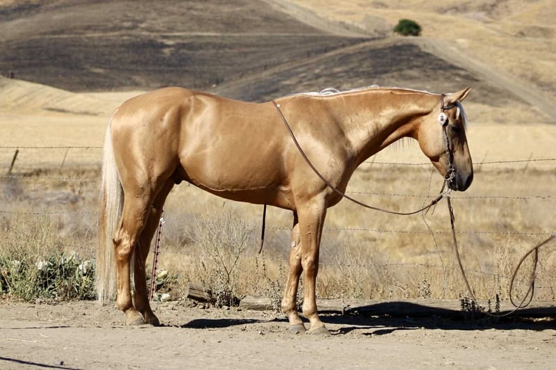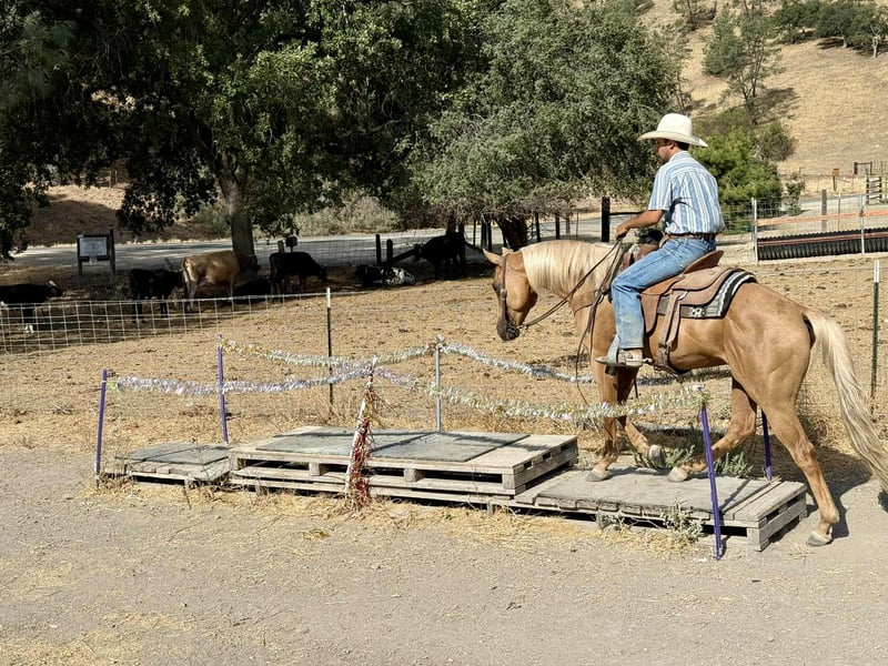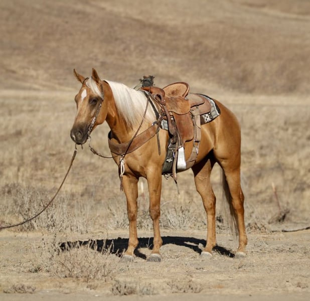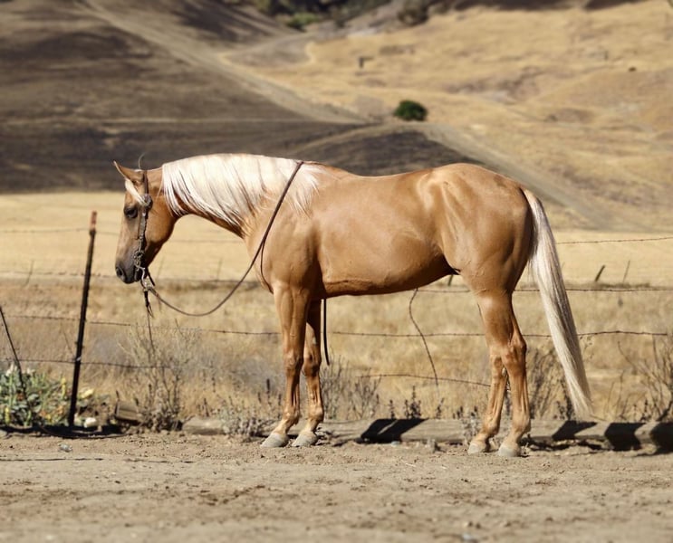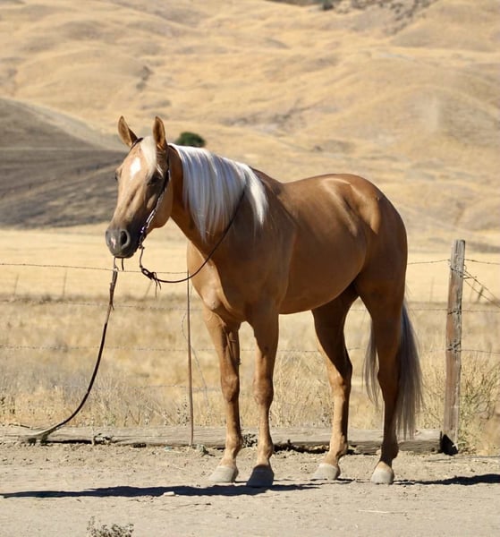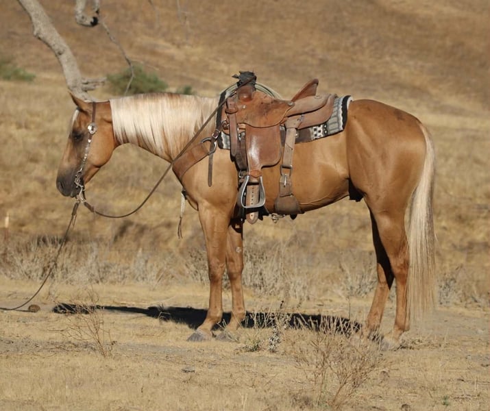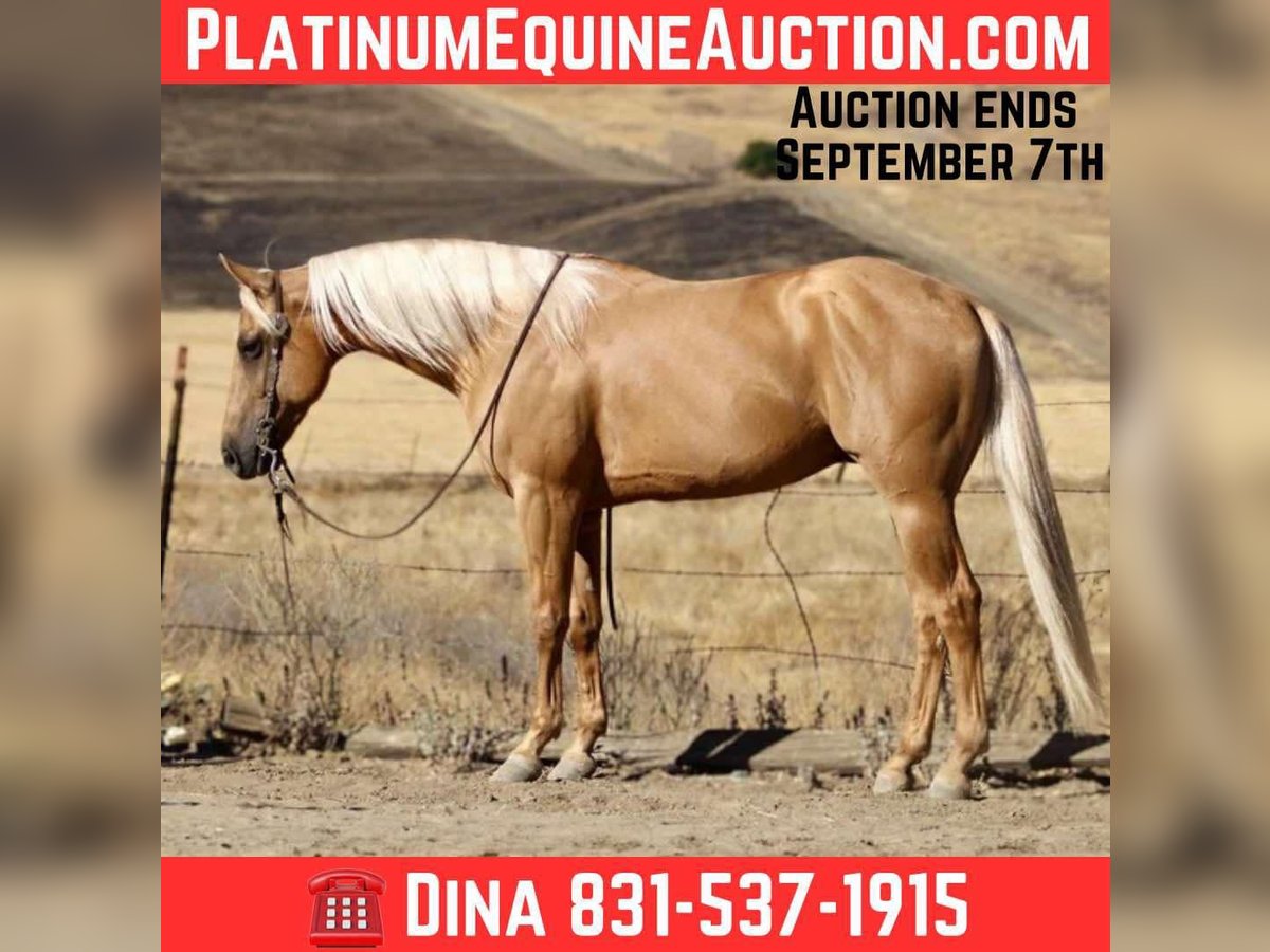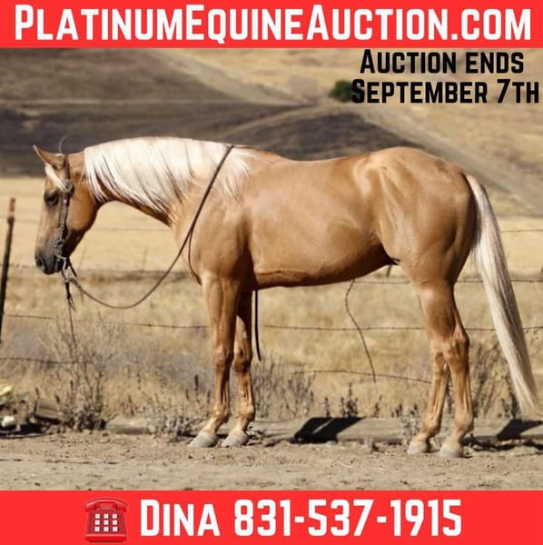 ONLINE AUCTION Place your bids at www.PlatinumEquineAuction.com Starting Bid $3500 Auction ends September 7th, 2025 Need a new saddle? Check out White Rock Saddles on our website or Facebook Alloy – The Golden Gentleman!!! Meet Alloy, a 6-year-old, 15 hand palomino gelding with a golden coat and a long blonde mane and tail that make him look like he was poured straight from the sun. Handsome doesn’t even begin to cover it—but Alloy isn’t just looks. He’s a broke, kind, and versatile partner with the talent of a tuned reiner and the quiet heart of a trail companion. In the arena, Alloy shows off his training. He carries himself collected, lopes off soft, and picks up both leads with ease. He’s light in the bridle, neck reins beautifully, and has a smooth, easy turnaround. Ask him for a stop and he’ll slide to a finish like a seasoned reiner—stylish, correct, and a joy to ride. Yet he never feels “too much” for his rider. Alloy can show you a fancy ride one moment, and the next, relax back into a steady, user-friendly gear that makes him suitable for anyone. On the trail, Alloy shines just as bright. Slip the reins on his neck, sit back, and let him do the thinking—he’ll go anywhere you point him. Alone or with a group, he’s the same horse every time. He’ll lead the way or follow along like a puppy dog, crossing rivers, climbing rocky hills, weaving through brush, or stepping over logs without hesitation. He’s been to obstacle courses where he’s handled car washes, tires, and teetering bridges with calm confidence, and he’s also been ridden through town traffic, around trains, semis, bicycles, and barking dogs, taking it all in stride. Alloy is no stranger to ranch work, either. He’s been used to gather cattle, check fences, and put in honest miles outside. He’s the kind of gelding you can trust for a long day’s work, then take on a leisurely trail ride the next day and know he’ll handle both with the same quiet willingness. On the ground, Alloy is a gentleman. He ties, clips, bathes, hauls, and stands for grooming or the farrier without fuss. He enjoys attention and is easy to handle, making him a barn favorite no matter where he goes. What makes Alloy truly special is his balance. He’s got enough training and style to impress any rider with his spins, slides, and buttons, but he’s just as content moseying down the trail or babysitting a rider who needs something safe and reliable. Alloy molds himself to his rider, making him both a polished partner and a peaceful companion. Located in Paicines, CA. Call Dina with Longhorn Ranch 831-537-1915 if you have any questions. ONLINE AUCTION Place your bids at www.PlatinumEquineAuction.com Starting Bid $3500 Auction ends September 7th, 2025 Need a new saddle? Check out White Rock Saddles on our website or Facebook