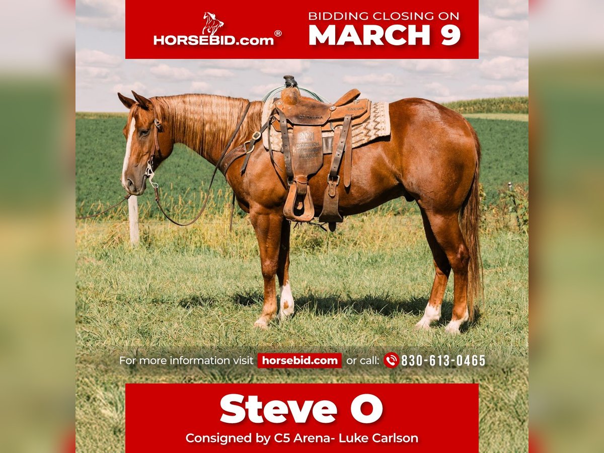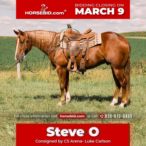 ℳ𝒶𝓇𝒸𝒽 ♦️𝐑𝐈𝐃𝐄𝐑'𝐒 𝐂𝐇𝐎𝐈𝐂𝐄♦️ Happening now thru MONDAY | MARCH 9th - Available EXCLUSIVELY on HorseBid's website! For more details and to register visit: www.Horsebid.com CONSIGNOR CONTACT: C5 Arena- Luke Carlson 830-613-0465 LOCATION: Decorah, IA BREED: AQHA REGISTERED: Yes REGISTERED NAME: Steve O COLOR: Sorrel HEIGHT: 15 AGE: 7 GENDER: Gelding Steve O is an exceptional 7-year-old gelding, owned by our family for the past 4 years and used as our kids’ personal horse. This is a truly broke, safe, and dependable individual that anyone can enjoy. Steve O is beautiful to look at and made correct from the ground up. He has been used as a ranch horse as well as heading and heeling. On the heel side he is consistent & has a nice stop. He is broke, balanced, and dependable every time. Steve-O scores and rates well and is in your hand. Steve-O is gentle, honest, and extremely trustworthy. He is quiet in the barn, easy to handle, and a true barn favorite that loves attention. He’s the kind that stays broke, takes care of his rider, and fits seamlessly into a family program—yet still has the ability and cow sense to go to work when asked. Bred as well as they come—by Stevie Rey Von, who needs no introduction, and out of One Sallycat, a daughter of One Time Pepto. The first dam earned $48,160, offering proven performance genetics, cow sense, and durability behind a horse that is as safe and broke as they come. Steve-O sells 100% sound. For any questions or more information regarding this talented gelding, please reach out to Luke 830-613-0465. Located in Decorah Iowa.