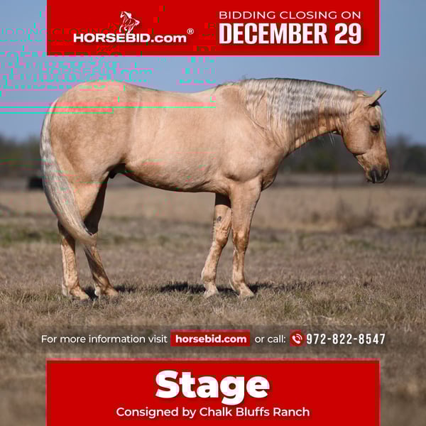 ⚜️ 𝓗𝓮𝓻𝓲𝓽𝓪𝓰𝓮 𝐖𝐢𝐧𝐭𝐞𝐫 𝓒𝓵𝓪𝓼𝓼𝓲𝓬⚜️ Happening now thru MONDAY | DECEMBER 29th - Available EXCLUSIVELY on HorseBid's website! For more details and to register visit: www.Horsebid.com CONSIGNOR CONTACT: Chalk Bluffs Ranch 972-822-8547 LOCATION: Mount pleasant TX BREED: Quarter Horse REGISTERED: No REGISTERED NAME: Stage COLOR: Palomino HEIGHT: 15.1 AGE: 7 GENDER: Gelding Meet Stage, a 7-year-old palomino gelding that’s the real deal and built to go to work. He is a seasoned ranch gelding** that has been used extensively on a large cow-calf operation, taking everything in stride from shipping, branding, and doctoring to long days outside. Stage is gentle, quiet, and very user-friendly**, making him a pleasure to ride whether you’re working cattle or just enjoying a day in the saddle. He stands 15.1 hands with a ton of frame and bone, giving him the substance and durability you want in a ranch horse. He rides easily in town, crosses water without hesitation, ties all day, loads well, and is good to shoe. Honest, broke, and dependable—Stage is the kind you can saddle up and go to work on, day after day. If you’re looking for a solid, good-minded palomino ranch gelding that’s already proven himself, Stage checks all the boxes.