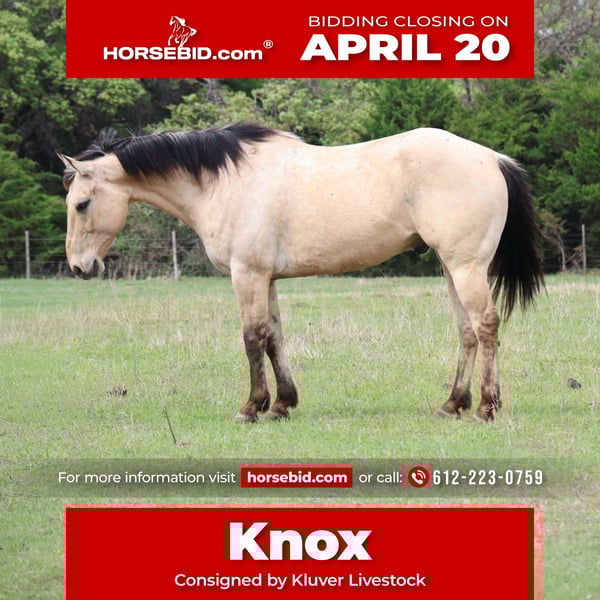 ⚜️𝐭𝐡𝐞 𝓔𝓵𝓲𝓽𝓮 𝐒𝐩𝐫𝐢𝐧𝐠 𝐂𝐥𝐚𝐬𝐬𝐢𝐜⚜️ Happening now thru MONDAY | APRIL 20th - Available EXCLUSIVELY on HorseBid's website! For more details and to register visit: www.Horsebid.com CONSIGNOR CONTACT: Kluver Livestock 612-223-0759 LOCATION: Ripley, OK BREED: AQHA REGISTERED: Yes REGISTERED NAME: High Driftin Woody COLOR: Buckskin HEIGHT: 15.2 AGE: 7 GENDER: Gelding Knox is the definition of a buckskin… I mean look at him with his gorgeous color! Knox is a 7 yr old gelding standing at 15.2 hands and weighing 1150 lbs! This buckskin gelding is the kind everyone is searching for good looking, gentle, and as honest as they come. With his eye-catching color and smooth, pretty way of moving, he’s the type that grabs attention everywhere he goes. He’s a true pleasure to ride with a comfortable stride and a soft, willing feel. He’s level headed, quiet, and the same horse every time you step on him. Whether you’re riding in the arena or out on the trail, he’s confident and steady, handling new places, obstacles, and whatever you point him at with ease. We’ve taken him through town, rivers, logs, rocky trails, anything you can come across on all day trail rides! His personality is what really sets him apart… he’s kind, easy to be around, and enjoys attention without being pushy. He’s the type that meets you at the gate and is always willing to go to work or just enjoy a laid-back ride. He has a great mind, stays gentle, and is easy to get along with in every way. He’s been used for full days of ranch work and knows what a job is. He’ll go all day without a fuss and still be the same quiet, dependable horse at the end of it. He’s been used at the feed lot for full days, out in the wheat field doctoring cattle, checking fences, anything you need done around your property! On top of that, he’s an easy keeper that stays in good shape with minimal upkeep, making him as practical as he is enjoyable. If you’re looking for a dependable, good-minded gelding that’s easy to ride, easy to own, and looks the part, this one checks all the boxes.