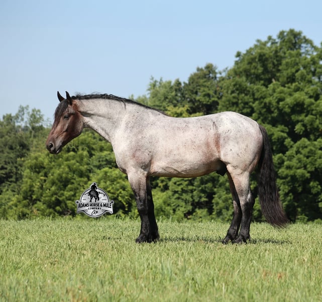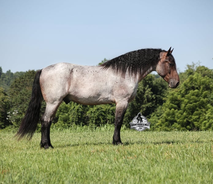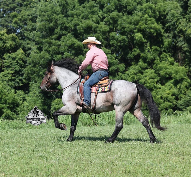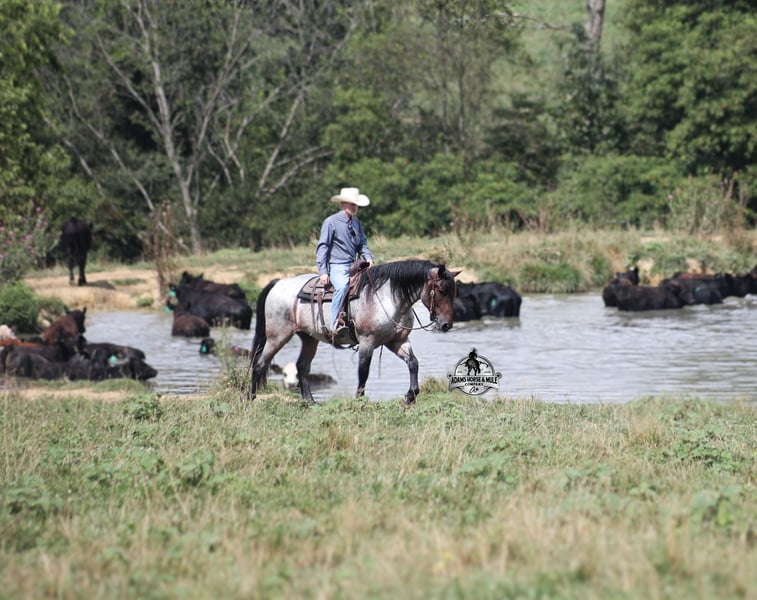 Rango is consigned to the Best Of The West Horse Sale in Gladstone, NJ on September 26-27th. You can bid online or bid in person. There is a preview day before the sale or you can come ride him prior to the sale in Mt. Vernon, KY. Rango is a 16h, 6 year old, Blue/Bay Roan Draftcross, gelding with movie star good looks, muscles upon muscles and that beautiful roan coloring you’d expect to see Rango on a Hollywood movie screen… Rango is trained to lay down and sit on command and he likes to show off his talents. He has been ridden around the ranch and used at brandings. Rango has a smooth trot, takes his leads and will lope nice circles. He neckreins around, has a good stop, sidepasses to open/shut gates and backs with ease. Rango has been exposed to all kinds of wildlife and he has been used in the mountains for hunting. Rango is great on the trails, he picks his way through rocky terrain, crosses deep water, scales slopes with ease and walks across deadfall as well. In addition to riding western he has been ridden English and has been over the jumps! Rango holds steady coming into the jumps and lands balanced. He has also been driven down the highways under harness and is traffic safe. Whether you want to ride around the ranch, trails, drive, do jumps or just lay down and take a nap together… Rango can do it all! For more info call 606-308-2461.