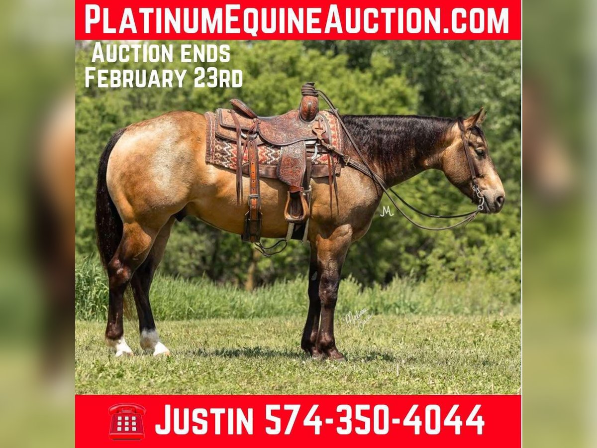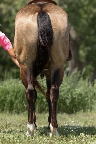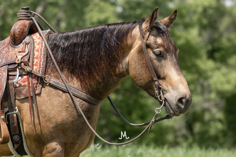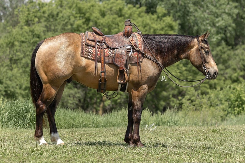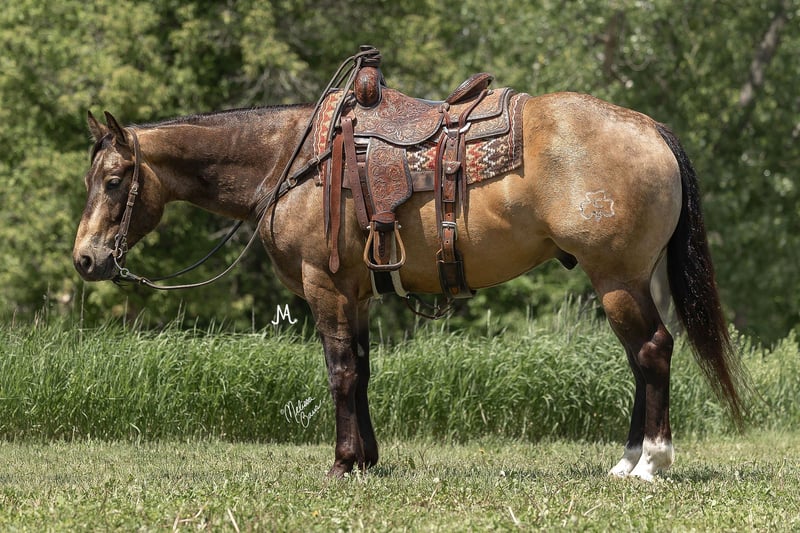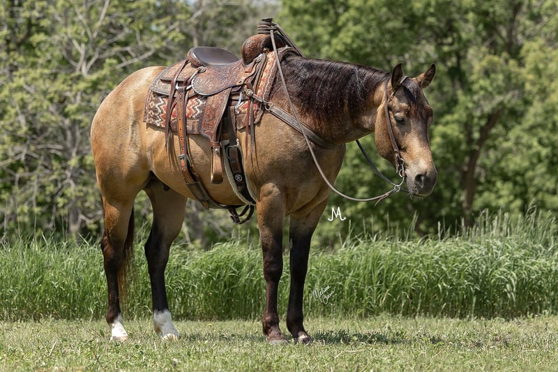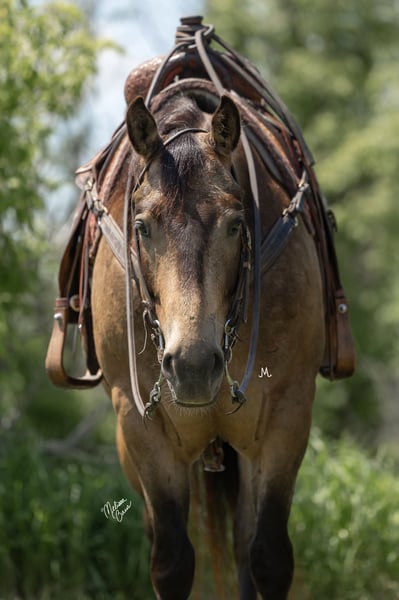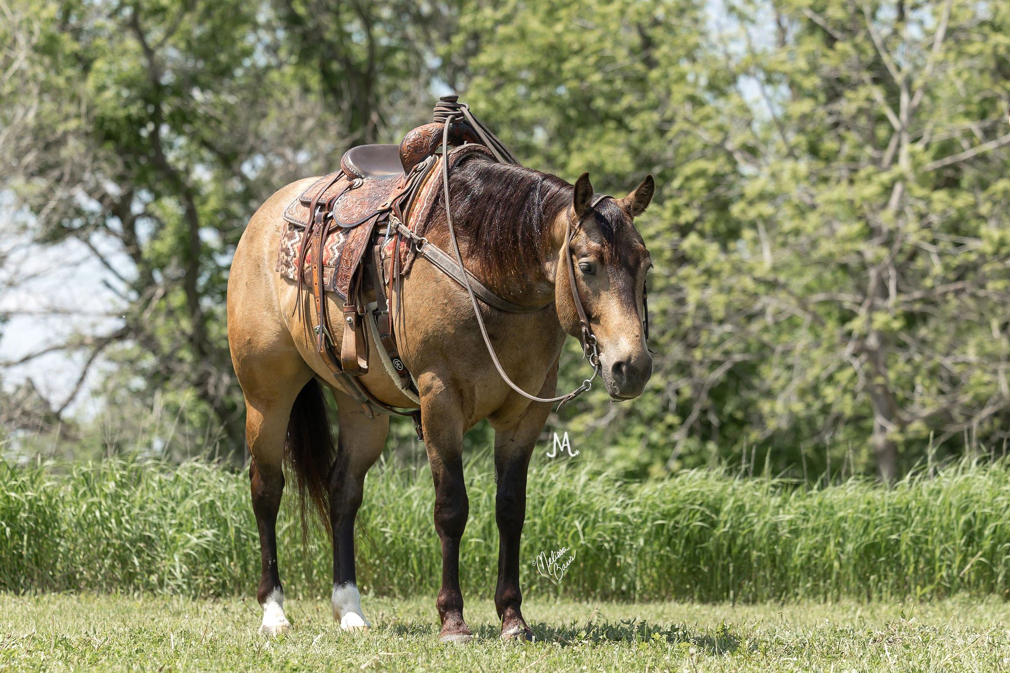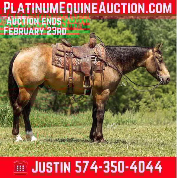 ONLINE AUCTION Place your bids at www.PlatinumEquineAuction.com Starting Bid $3500 Auction ends February 23rd, 2025 Need a new saddle? Check out White Rock Saddles on our website or Facebook! A Nu Shiney Step aka Mikey is a big, stout, 1350lb, 15.1 hand gelding with a lot of shape and wonderful conformation. He’s gorgeous buckskin with tons of dapples! Mikey has great bloodlines being a son of Xtra Shiney Wimp, going back to Wimpys Little Step, Shining Spark and is the perfect age with his whole entire life left yet ahead of him. Not to mention, He’s as gentle as they come! He’s been roped off of in the pasture and at brandings. He’s wonderful in the arena, and has a lot of feel and power to his gaits, yet he’s light and responsive to all cues! He’s easy to ride and will excel in most any discipline. Mikey is great riding by himself or with other horses. He has been tied overnight and stands well for all saddling, grooming, etc. as well. Mikey is a rockstar to ride outside. He has a lot of trail miles and ranch miles under his belt. Mikey is not afraid of much, if anything. He’s not spooky and is always one of the most confident horses in the herd. He will cross water, go over tarps, thick brush, etc. Mikey also has drug calves, logs, basically everything. He is content to work in the arena all day or just be your next best friend. He is always the first one to greet us outside. We’ve owned him for a couple of years now and he has never been sick or sore. Mikey is in a stall sometimes, in the pasture a lot, and has been by himself and in a herd. He will not bully others – and he’s not going to get pushed around, either! He is a super easy keeper. Everybody loves him, he is so easy to own! He’s not only America’s favorite color, but hes well-bred, very easy to ride, and loves to be around people. We’ve owned him for a couple of years now, and he has never had a sick day, nor has he ever had any lameness. Mikey is UTD on all routine cares and is ready for his next chapter in life to begin! Ranch Riding, Roping, Trails, Western Dressage, you name it. Contact Us for more information on him today! Located in River Falls, Wisconsin, shipping is available anywhere in the US and Canada. If you would like to schedule a time to come see Mikey, set up a facetime call or if you have any questions, contact Michels Performance Horses Justin 574-350-4044 we would love to chat with you! ONLINE AUCTION Place your bids at www.PlatinumEquineAuction.com Starting Bid $3500 Auction ends February 23rd, 2025 Need a new saddle? Check out White Rock Saddles on our website or Facebook!