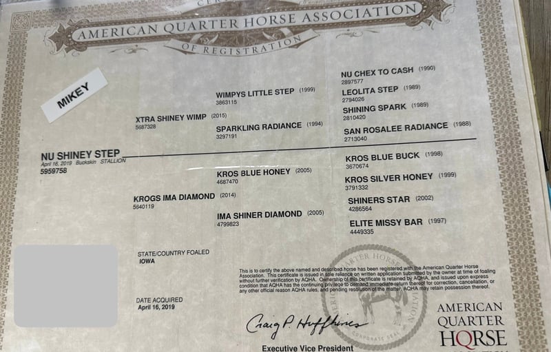 ONLINE-AUKTION Geben Sie Ihre Gebote unter www.PlatinumEquineAuction.com ab. Startgebot $3500 Die Auktion endet am 23. Februar 2025. Brauchen Sie einen neuen Sattel? Schauen Sie sich White Rock Saddles auf unserer Website oder Facebook an! A Nu Shiney Step alias Mikey ist ein großer, kräftiger, 1350lb, 15.1 Hand Wallach mit einer Menge von Form und wunderbarem Körperbau. Er ist ein wunderschönes Wildschwein mit vielen Schimmelflecken! Mikey ist ein Sohn von Xtra Shiney Wimp, der auf Wimpys Little Step, Shining Spark, zurückgeht und hat das perfekte Alter, um sein ganzes Leben noch vor sich zu haben. Ganz zu schweigen davon, dass er so sanftmütig ist wie nur möglich! Er wurde auf der Weide und beim Branding abgeseilt. Er ist wunderbar in der Arena und hat viel Gefühl und Kraft in seinen Gängen, dennoch ist er leicht und reagiert auf alle Kommandos! Er ist einfach zu reiten und wird sich in fast jeder Disziplin auszeichnen. Mikey kann sowohl alleine als auch mit anderen Pferden geritten werden. Er wurde über Nacht angebunden und lässt sich auch gut satteln, putzen usw. Mikey ist ein Rockstar beim Ausreiten. Er hat schon viele Kilometer im Gelände und auf der Ranch hinter sich. Mikey hat vor kaum etwas Angst, wenn überhaupt. Er ist nicht ängstlich und immer eines der selbstbewusstesten Pferde in der Herde. Er überquert Wasser, geht über Planen, dichtes Gestrüpp usw. Mikey hat auch schon Kälber, Baumstämme, einfach alles, betäubt. Er ist zufrieden damit, den ganzen Tag in der Arena zu arbeiten oder einfach nur Ihr nächster bester Freund zu sein. Er ist immer der erste, der uns draußen begrüßt. Wir besitzen ihn nun schon seit ein paar Jahren und er war noch nie krank oder angeschlagen. Mikey steht manchmal im Stall, ist oft auf der Weide und war schon allein und in einer Herde. Er schikaniert andere nicht - und er lässt sich auch nicht herumschubsen! Er ist ein super einfacher Pfleger. Alle lieben ihn, er ist so einfach zu halten! Er ist nicht nur Amerikas Lieblingsfarbe, sondern auch gut erzogen, sehr leicht zu reiten und liebt es, unter Menschen zu sein. Wir besitzen ihn jetzt seit ein paar Jahren, und er war noch nie krank, noch hatte er jemals eine Lahmheit. Mikey ist bei allen Routineuntersuchungen UTD und ist bereit für seinen nächsten Lebensabschnitt! Ranch Riding, Roping, Trails, Western Dressage, was auch immer Sie wollen. Kontaktieren Sie uns noch heute für weitere Informationen über ihn! Wir befinden uns in River Falls, Wisconsin, und können ihn überall in den USA und Kanada versenden. Wenn Sie einen Termin vereinbaren möchten, um Mikey zu sehen, ein persönliches Gespräch zu vereinbaren oder wenn Sie Fragen haben, kontaktieren Sie Michels Performance Horses Justin 574-350-4044, wir würden uns freuen, mit Ihnen zu sprechen! ONLINE-AUKTION Geben Sie Ihre Gebote unter www.PlatinumEquineAuction.com ab. Startgebot $3500 Die Auktion endet am 23. Februar 2025. Brauchen Sie einen neuen Sattel? Schauen Sie sich White Rock Saddles auf unserer Website oder Facebook an!