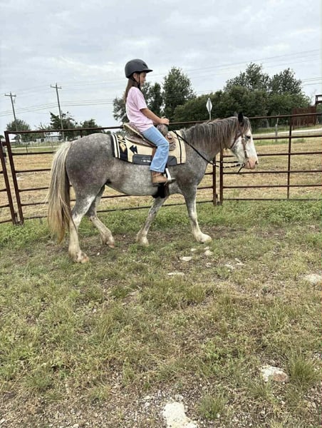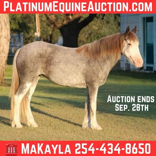 ONLINE AUCTION Place your bids at www.PlatinumEquineAuction.com Starting Bid $3500 Auction ends September 28th, 2025 Need a new saddle? Check out White Rock Saddles on our website or Facebook Looking for a reliable, beautiful, and family-friendly horse? Look no further than Bluebell! This stunning 7-year-old blue roan Gypsy Vanner/Paint cross is the ideal horse for trail riding, family adventures, and creating lasting memories. Standing at a sturdy 14 hands, Bluebell is the perfect size for both kids and adults to enjoy. Bluebell has a heart of gold and a gentle disposition that makes her a joy to be around. She rides English or Western! We been using her for people to learn English on and she’s been a great teacher for kids and adults. Bluebell is patient and forgiving, making her an excellent choice for inexperienced riders. She has been use in kid camps for lessons. Bluebell has also carried around autism kids letting them enjoy a great ride. She is always eager to please and loves attention, whether it’s grooming, trail rides, or just hanging out in the pasture. Bluebell truly shines on the trails or in the arena. Her calm demeanor and sure-footedness make her a reliable partner in any terrain. She handles various trail obstacles with ease. Water crossings, rocky paths, or wooded areas – Bluebell takes it all in stride. She’s safe around traffic, fire, and even trails. I’ve done a little bit of everything on her. Bluebell is more than just a trail horse; she is a member of the family. Her gentle nature makes her safe and fun for the family to ride and handle. She loves being groomed, petted, and spending time with her person. Bluebell is also easy to catch in the pasture and stands quietly for mounting and dismounting. Bluebell is up-to-date on everything. She is one of a kind that we will be sad to see leave if her forever person comes! Come see her for yourself or we can schedule a FaceTime to meet her! Call or text Makayla with MW Horses at (254)434-8650. Need hauling? We got a list of reliable haulers around the US! ONLINE AUCTION Place your bids at www.PlatinumEquineAuction.com Starting Bid $3500 Auction ends September 28th, 2025 Need a new saddle? Check out White Rock Saddles on our website or Facebook