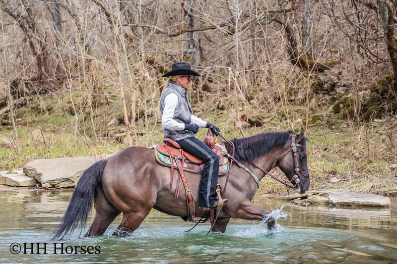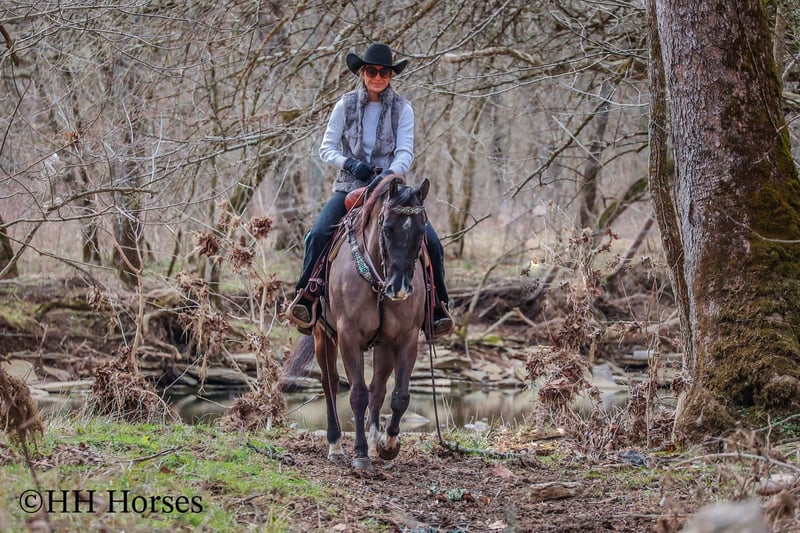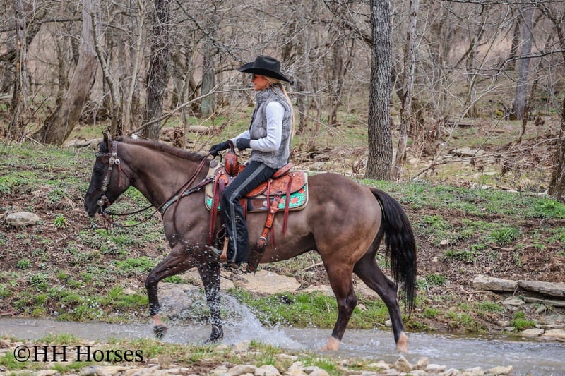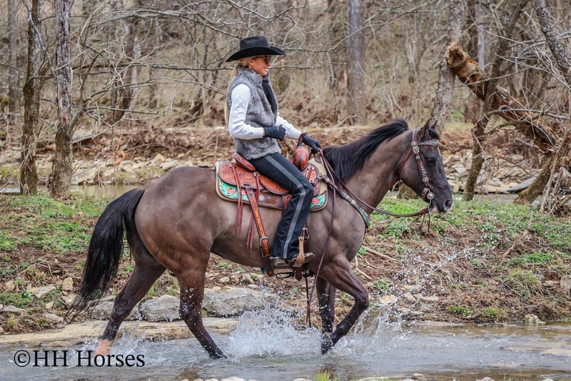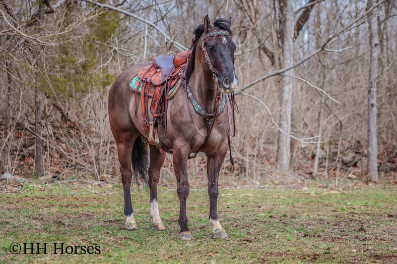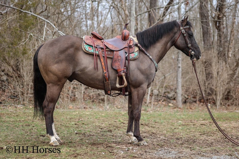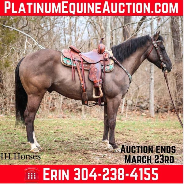 ONLINE AUCTION Place your bids at www.PlatinumEquineAuction.com Starting Bid $3500 Auction ends March 23rd, 2025 Need a new saddle? Check out White Rock Saddles on our website or Facebook! This is “RANGER”, a real cool unique GRULLA QUARTER HORSE GELDING that is well broke. He has been used for ranching and trail riding. He stands a muscular 14.2 hands tall and is built like the old school Quarter Horse geldings. He has a wide set forehead, a small muzzle, small cute ears, and dark eyes. He is 7 years old. This gelding is well broke and handy. He will one hand neck rein, lope around low headed and quiet, and is relaxed when out trail riding. This gelding has been ridden in the pastures to check cattle. He has been through the woods, through deep water, and over rocky terrain. This gelding will ride out alone and has been ridden in groups. He is a good horse to have around for anyone to ride. He has excellent ground manners, loads, stands tied, and hauls. He is fine with dogs trailing his heels. He will unload in new surroundings and ride off with no issues. He lopes off with no hump and no buck. Located in Flemingsburg, KY. For more info or to make a Buy It Now Offer contact HH Horses Erin 304-238-4155 ONLINE AUCTION Place your bids at www.PlatinumEquineAuction.com Starting Bid $3500 Auction ends March 23rd, 2025 Need a new saddle? Check out White Rock Saddles on our website or Facebook!