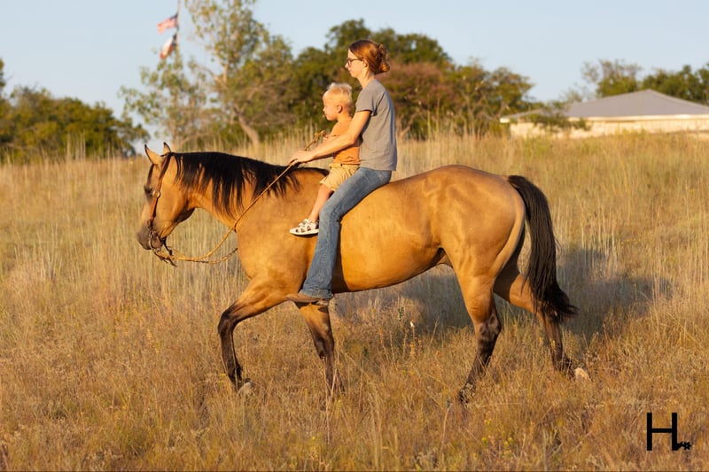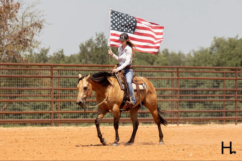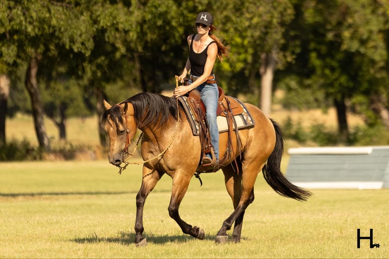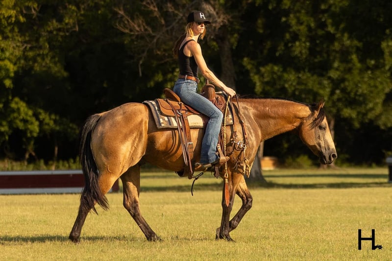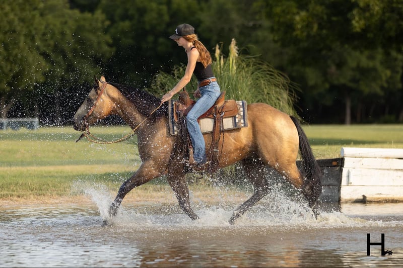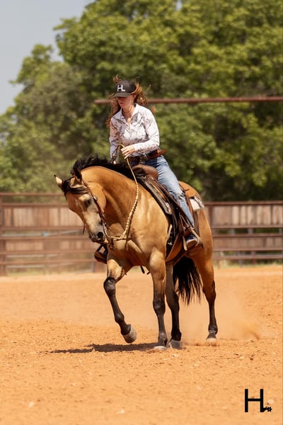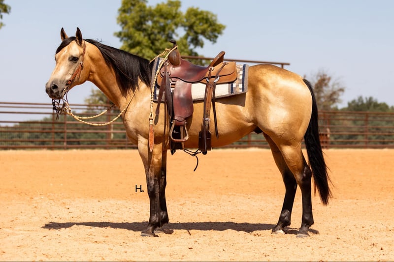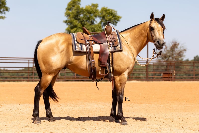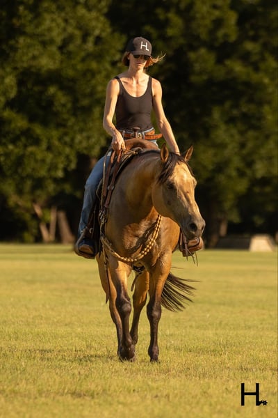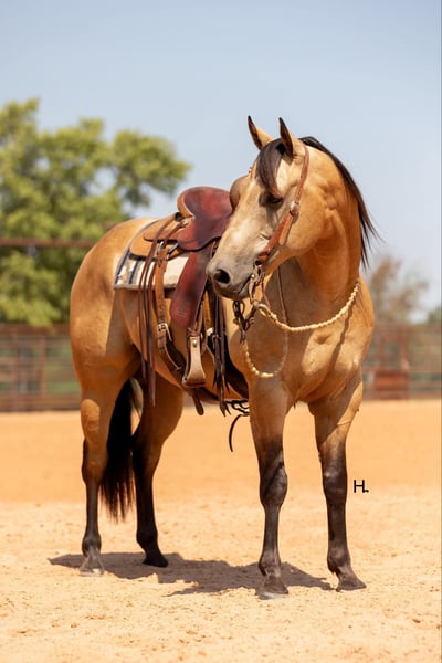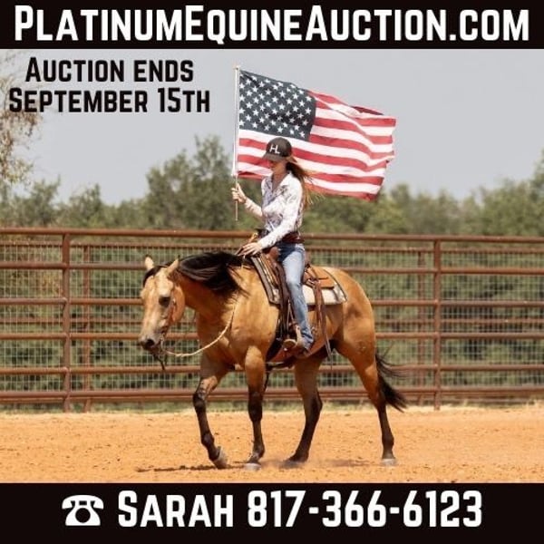 ONLINE AUCTION Place your bids at www.PlatinumEquineAuction.com Starting Bid $3500 Auction ends September 15th, 2024 Need a new saddle? Check out White Rock Saddles on our website or Facebook! Cartels Gunsmoke is a 6yr old, 14.3hh, AQHA registered gelding, “Kodak”, as he is affectionately known, is our little golden boy. Everywhere he’s gone he’s gotten compliments, not only his looks but his demeanor as well, and no matter the job you task him with he’s going to try his hardest to do and be the best; whether that’s doing work from sun up to sun down on the ranch, hitting the show pen in ranch versatility classes, packing toddler and youth riders around, or going for a trail ride. Kodak is no stranger to a hard days work and has been used in all aspects of ranch work. Most recent on his ranching resume, he was the main mount used on a 70,000 acre ranch in New Mexico where he gathered, sorted, doctored, branded, and loaded trucks. Where he was at in New Mexico is considered the high desert. If you’re unfamiliar with what the high desert entails, it is a vast and rocky environment which helped contribute to Kodak’s sure footedness. He will go all day for ranch work and has an extremely comfortable trot to set out at to check fence. Besides being used for ranch work outside, Kodak also has experience exploring state parks and trails where he will walk out on a loose rein alone or in a group and is a happy camper no matter how long or short of a trail ride you’d like to have. In the arena, Kodak is also a joy to ride. He’s smooth and fluid in all gaits and transitions and stays soft and supple in your hand. He has an easy turn around, can pick up both his leads from a walk, and will come right down to a slower gait or stop by a simple lift of your hand and some seat pressure. He’s easy to get along with in the saddle, has packed around inexperienced kids including our 3yr old son whom Kodak has been helping teach how to ride, and is a happy medium between “whoa” and “go” as he’ll go the pace that’s asked of him. Recently Kodak has dived into the show world of ranch versatility and has shown he has real potential to be a star in it with a few more shows under his belt. He does all maneuvers needed for trail (opening/closing gates, dragging logs, bridges, backing Ls, log jumps, water crossings, etc.), is pleasant in a cramped rail class, has a beautiful extended trot for your pleasure and ranch riding classes, has a solid foundation laid for the reining, and has a ton of natural cow sense for your cow work classes. He won’t be your open division winner, but Kodak is absolutely a mount a Non-Pro/Amateur/Youth could enjoy, show, and be successful with. On the ground, Kodak is as pleasant as a horse could get. He stands for absolutely everything like a gentleman, loves being doted on, is easy to catch, gets a long with others in a herd well, stalls with no issues, and is gentle enough that I have no second thoughts when it comes to my 3yr old son playing around Kodak or handling Kodak by himself. Kodak is UTD on all care from teeth to vet work and has a recent health exam on file including x-rays of his front feet and hocks with no remarkable findings. He requires no maintenance and has no bad habits or vices. Kodak has a personality as golden as the color of his coat and we absolutely love and adore him in every way. Being as phenomenal as he is at just 6yrs of age, the sky truly is the limit when it comes to the possibilities with this gelding. Whether you want a solid horse to use on your ranch, your next up and coming show horse, or a horse that the whole family can enjoy… Kodak can fill the position! H Spur Performance & Versatility Horses invites you to come meet Kodak in Weatherford, Tx and we can help assist setting up hauling nationwide. For any questions or to talk about if Kodak is the right fit for you, please contact Sarah at 817-366-6123. To watch all of Kodiak’s available videos in their entirety as well as view his health exam and additional pictures, please visit www.hspurhorses.com/cartelsgunsmoke ONLINE AUCTION Place your bids at www.PlatinumEquineAuction.com Starting Bid $3500 Auction ends September 15th, 2024 Need a new saddle? Check out White Rock Saddles on our website or Facebook!