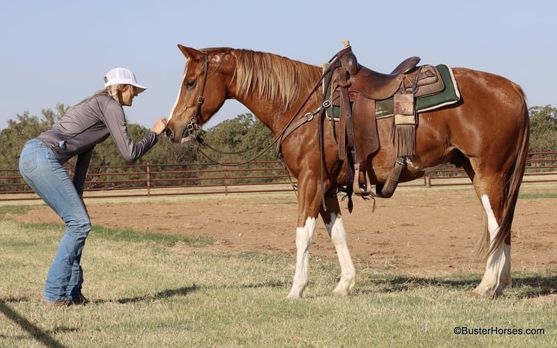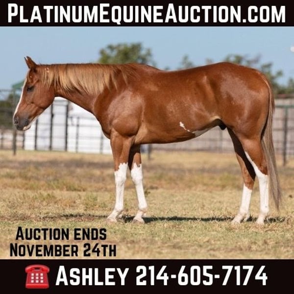 ONLINE AUCTION Place your bids at www.PlatinumEquineAuction.com Starting Bid $3500 Auction ends November 24th, 2024 Need a new saddle? Check out White Rock Saddles on our website or Facebook! Champ is 6 years old and 15.1hh just the right age, just the right size – and has the loud flashy markings that everyone’s looking for! He is extremely smooth gaited and uncomplicated to ride, but still fun! He has a nice handle, a big stop, and travels really cute too! He would be fun to take to the local hunter/jumper shows, or the entry level dressage tests. He trail rides great, he absolutely loves going into town and being around lots of traffic and commotions and things to see! He has been tons of miles checking fences and checking cattle, and he is very comfortable out alone as well as in a group of horses. He’s even been used in the cutting pen, as a turn back horse at a cutting facility, and he was the resident “non-rider” mount. Anyone can get along with this sweet guy he has a ton of personality and he’s always the first one up to you in the pen. He loves attention and if he’s out in the pasture with a group of horses he’ll come up to you versus hanging out with the horses he loves scratches loves cookies and loves attention. He is great in the barn, stands tied quietly, he is easy to saddle and bridle, stands flat-footed and still for mount and dismount, he hops right on the trailer, and hauls quietly too. Champ was just shod this week, his teeth were also done by an equine dentist earlier this year, at that time he also had his ears preemptively treated for ticks, and he was also power pack wormed. He will arrive at her new home up-to-date and ready to go to work! Please call anytime for more information at 214-605-7174 Champ is located in Weatherford, TX – one hour from Dallas / Fort Worth International Airport. He is an easy day trip or fun overnight trip to come try out, from anywhere! We are experienced knowledgeable sellers and we can help with quickly arranging affordable shipping to any buyer’s location – we have experience shipping horses worldwide – including regularly to Hawaii, Canada, Mexico, Europe, and South Africa. Go to our Facebook page Buster Ranch and check our website for buyer reviews. ONLINE AUCTION Place your bids at www.PlatinumEquineAuction.com Starting Bid $3500 Auction ends November 24th, 2024 Need a new saddle? Check out White Rock Saddles on our website or Facebook!