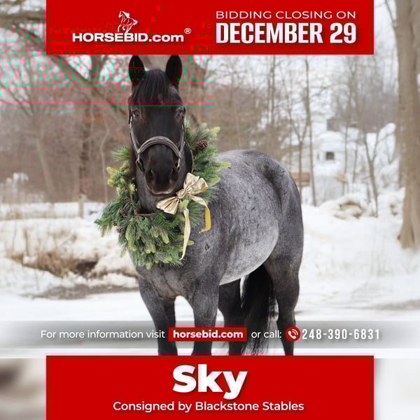 ⚜️ 𝓗𝓮𝓻𝓲𝓽𝓪𝓰𝓮 𝐖𝐢𝐧𝐭𝐞𝐫 𝓒𝓵𝓪𝓼𝓼𝓲𝓬⚜️ Happening now thru MONDAY | DECEMBER 29th - Available EXCLUSIVELY on HorseBid's website! For more details and to register visit: www.Horsebid.com CONSIGNOR CONTACT: Blackstone Stables 248-390-6831 LOCATION: Howell, MI BREED: Quarter horse REGISTERED: No COLOR: Blue Roan HEIGHT: 15.1 AGE: 8 GENDER: Gelding Meet Sky, he is an 8 year old 15.1hh true blue roan grade quarter horse gelding. Sky has the most stunning color you will see! He has a gorgeous black mane and tail that compliments his blue roan coat beautifully. Sky has nice sturdy conformation. He has some of the best ground manners you may see on a horse. He stands tied anywhere, to anything, as long as you like. He's extremely patient for grooming, tacking and just to be doted on. Sky has mainly been a trail horse. He's been ridden on the road, in open fields and deep woods. He has also been ridden in the arena. Sky will walk trot and canter with ease. His transitions are effortless. He has a happy go lucky attitude and a great work ethic! Sky can live inside or outside and gets along very well with all other horses and ponies in turn out. If you're looking for a stunning blue roan that can go in any direction, check out his video!!