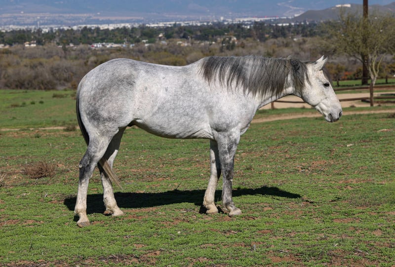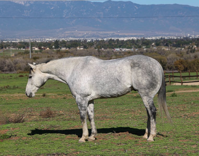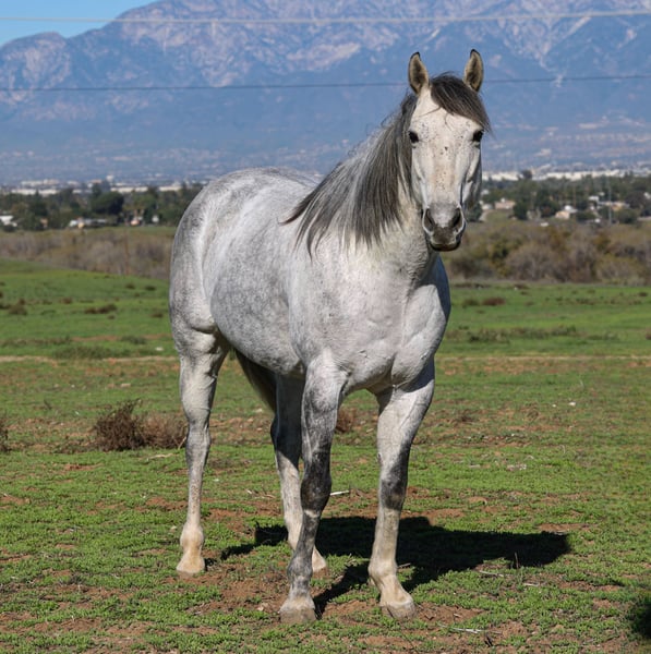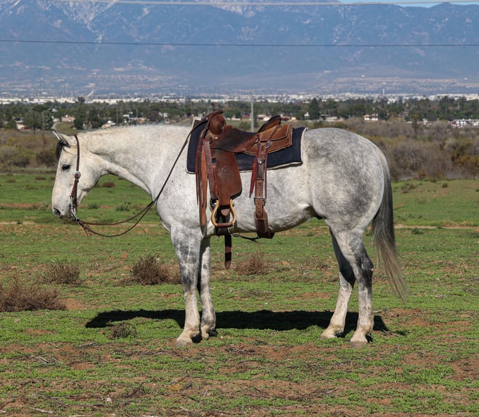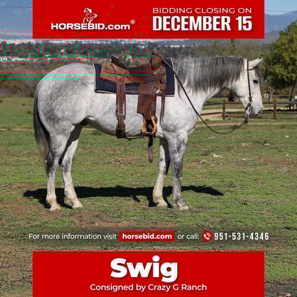 🎄𝐓𝐇𝐄 𝑯𝒐𝒍𝒊𝒅𝒂𝒚 𝐂𝐋𝐀𝐒𝐒𝐈𝐂🎄 Happening now thru MONDAY | DECEMBER 15th - Available EXCLUSIVELY on HorseBid's website! For more details and to register visit: www.Horsebid.com CONSIGNOR CONTACT: Crazy G Ranch 951-531-4346 LOCATION: Norco CA BREED: Quarter horse REGISTERED: No COLOR: Dapple grey HEIGHT: 15.1 AGE: 7 GENDER: Gelding Swig is a beautiful 7 year old quarter horse gelding! If your looking for a nice well rounded gelding that is built to last look no further! Swig is sure footed, with solid clean legs. This gelding will cover trails and is as solid as one comes with being exposed to all rocky terrain, steep mountains and city trails! He has been ridden all over the City of Norco, with barking dogs, heavy street traffic, trash bags, motorcycles etc! He has taken care of beginners on the trails and in the arena! Swig is a smooth ride and rides easy in the arena. He catches both leads, rides with a level head and has a smooth trot. Swig moves off the leg, side passes, opens and closes gates and will ride one handed with a neck rein or you can direct rein him! Swig has been roped off of plenty of times on the ranch, has dragged calves to the fire and has gathered. Swig is cowy and does well in the cow sorting ring! Swig has roped a handful of live cattle in the arena. Swig not only is well rounded in the western discipline but he also will ride English and is a beautiful mover! He has been over cross rails and can go further on with his jumping career! Swig would excel in any discipline, he loves to work, easy to get along with and he goes with the flow! Swig sells 100% sound. He has no scars, lumps, or bumps and has never coliced. Swig is easy to catch, tie, saddle and groom. He has a puppy dog personality and loves affection from humans!