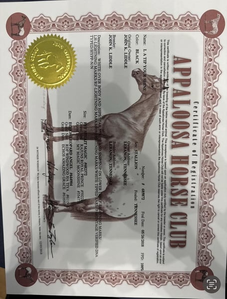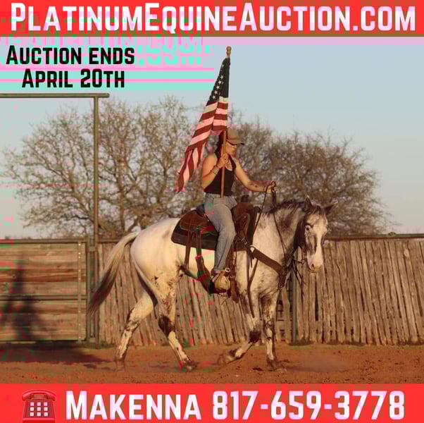 ONLINE AUCTION Place your bids at www.PlatinumEquineAuction.com Starting Bid $3500 Auction ends April 20th, 2025 Need a new saddle? Check out White Rock Saddles on our website or Facebook! Check out this amazing gelding we have had the opportunity to offer to the public, Tip! Tip is an astonishing registered Appaloosa gelding! Just look at his color! At only 7 years old, this gelding is ready to find his forever family! This guy is always eager to do is job. This horse not only looks majestic, but he rides like it too. Walk, trot, lope, this horse moves like a dream. He even rides English! The kind of a horse that you can show off to all of your friends. This is the ultimate gift for any family member, as he is gentle and safe! Tip is well broke, does whatever is asked of him no matter what, he makes it fun! Tip has been shown in numerous ranch pleasure classes, trail classes, etc, and he LOVES the show ring! This is the perfect trail horse, as he doesn’t have a care in the world, loves just to go all day with his person. He rides great in the arena, knows both his leads, has a smooth trot as well! I could write a book about him all day but he speaks for himself! No matter how busy your life may get, Tip is always ready to saddle up and ride off without a care in the world! He will always meet you at the gate, especially with a little cookie interruption. Located in Lipan Texas We can help arrange hauling anywhere in the US, Hawaii or Canada! Please call or text Makenna Hartzell 817-659-3778. ONLINE AUCTION Place your bids at www.PlatinumEquineAuction.com Starting Bid $3500 Auction ends April 20th, 2025 Need a new saddle? Check out White Rock Saddles on our website or Facebook!