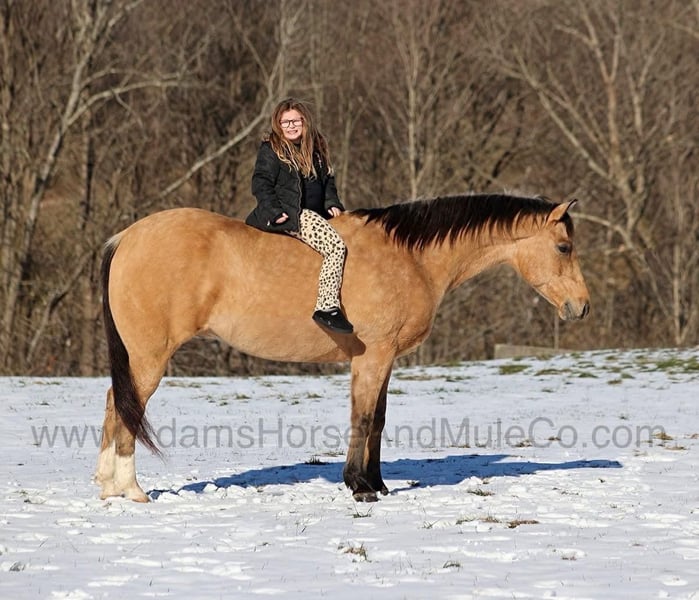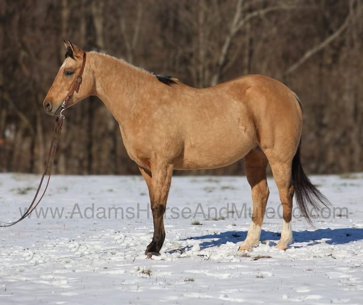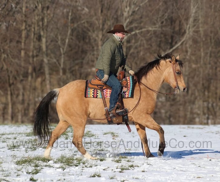 Go to visit our website for more pics and a video. AHAMC has been in the horse business and sold horses over the internet since 2005. We have a long track record of success with hundreds of happy customers. We work hard to match riders with the correct horses and specialize in beginner safe, family friendly horses that have been used and checked out by our family! Willy’s Dusty Zipper is a stout and I mean Stout built 15.2H, 2018 Model registered AQHA, Dappled Buckskin Quarter Horse Gelding. Willy is a well traveled horse that has been ridden in several states and has been used as a ranch horse. From herding to sorting, Willy has done it all! Willy has been trail ridden in several states and been in some high country that is very rough and rocky. He will cross creeks, ditches, logs and navigate rough rocky areas. Willy has a smooth jog and one of the smoothest lopes that you will set on! Willy has been ridden by our kids and is slow and easy with more whoa than go! Willy has been exposed to all kinds of wildlife such as deer or turkey or other animals like cows or dogs and will go anywhere that he is asked too. He has been ridden many miles in the mountains of Eastern Kentucky and encountered every obstacle possible on the trail. He will go up or down even the steepest slopes, across deep creeks, over downed trees, and over all types of rough terrain while still being sure footed. If you want to feel and look like a real deal cowboy/cowgirl just climb on Willy and he will make you look like one with that classic Matt Dillon buckskin color! If you have any questions call Eric 606-308-2461.