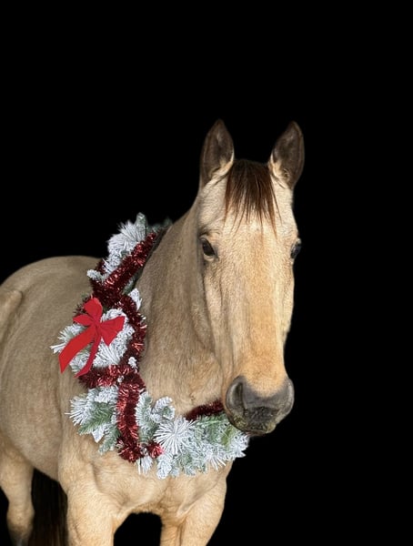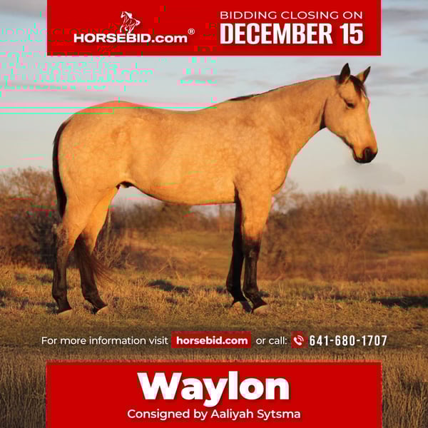 🎄𝐓𝐇𝐄 𝑯𝒐𝒍𝒊𝒅𝒂𝒚 𝐂𝐋𝐀𝐒𝐒𝐈𝐂🎄 Happening now thru MONDAY | DECEMBER 15th - Available EXCLUSIVELY on HorseBid's website! For more details and to register visit: www.Horsebid.com CONSIGNOR CONTACT: Aaliyah Sytsma 641-680-1707 LOCATION: Plano, IA BREED: QH REGISTERED: No REGISTERED NAME: Waylon COLOR: Buckskin HEIGHT: 15.2 AGE: 7 GENDER: Gelding He may not fit under the tree, but he will stand long enough to wrap him up for the perfect Christmas present! Let me introduce Waylon! He is 7 years old, 15.2 hands tall and the definition of QUIET! Waylon has the sweetest personality! He is the first to greet you at the gate, stands tied, loves to be groomed, loads easy, backs out of the trailer, easy to tack up. He is safe for ANY level of rider! His favorite pace is walk but will easily trot and lope smoothly on the correct lead when asked! A great stop and easy back. He has seen more miles on the trails than your neighbors old coon dog. He crosses water, logs, and ditches with ease. He will lead the group or bring up the tail end and he has been packed on numerous times! Load him up with whatever you need to carry and he gets the job done. Waylon is as reliable as your old farm truck- he shows up every day no matter the conditions and gets you from point A to point B without a single issue. He dosent have all the fancy bells and whistles but he is the tried and true trail horse that will take care of you every single time! Waylon ha also been exposed to ALL the “silly” things. While we didn’t get videos of everything he has been shot off of, carried a tarp, carried a flag, rode through party balloons, will stand in a circle of fire, had fire works lit off of him, cracked a bull whip, done the yoga ball, and soooo much more. Not a single thing phases this guy! While Waylon probably wouldn’t be my top pick for “quick” ranch work he is a pro at ponying colts, moving cows to pasture, and will pull anything! I seriously think this guy could make a dang good police horse or a pony track horse! Or simply just take him and enjoy him on the trails! You really can’t go wrong with one this quiet. He has zero buck, bite, rear or kick. Waylon is parrot mouthed- this does not affect him in ANY WAY. He eats out of a hay bag with smalls holes just fine, and eats out in the pasture like a fat pig. He is 100% sound, no previous injuries or health issues. He does not require any special maintenance. Very easy keeper, barefoot hooves. He has had shoes on before when rode in very rocky country but does not need them just a preference of ours. Please feel free to call me I could talk all day long about him! 6416801707.