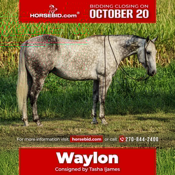 ♦️ 𝐭𝐡𝐞 𝐀𝐌𝐄𝐑𝐈𝐂𝐀𝐍 𝓕𝓪𝓵𝓵 𝓒𝓵𝓪𝓼𝓼𝓲𝓬 ♦️ Happening now thru MONDAY | OCTOBER 20th - Available EXCLUSIVELY on HorseBid's website! For more details and to register visit: www.Horsebid.com CONSIGNOR CONTACT: Tasha Ijames 270-844-2400 LOCATION: Henderson,KY BREED: Quarter Horse REGISTERED: No COLOR: Grey HEIGHT: 15.3 AGE: 7 GENDER: Gelding Waylon is a 7yr old grade quarter horse gelding standing at 15.3hh! He is a gorgeous dapple gray, with the sweetest personality! He is a dream to ride! He has the smoothest trot and canter! His walk, is easy and slow making him a great trail horse! He is very forgiving, and a great horse for all levels of riders! He is safe and dependable! Waylon moves nicely and listens to cues well! You can saddle him up and ride off or just hop on him bareback. He is as honest as the day is long and the same horse everytime you take him on a ride! We have taken Waylon to state parks on rides and overnight camping trips! He does great at new places and takes everything in stride! Waylon is great in all types of trail group settings, and will lead the pack or follow! He is remarkably surefooted, you can count on him to pay attention and navigate any terrain you put in front of him. He loves water and will cross creeks, steps over logs and doesn't mind the steep hills! He doesn't mind the traffic, heavy machinery and is used to being around dogs as well! Waylon has also turned back cattle, has been ridden all over the pastures checking yearlings and cow/calf pairs. He has been roping the sled and doing great. He is an all around sweet gelding and so fun to ride! Waylon also rides very well in the arena, he will pick up both leads, he stops and backs up! You can ride him on a lose rein and neck rein or he will direct rein as well! He is a very smart guy and adapts well to new riders! Waylon is one of the sweet and gentlest gelding you will meet! He is very affectionate and is the first to meet you at the gate, and will be a great asset to become a lifetime partner for the family! If you would like to schedule a time to come meet and ride Waylon, or have any other questions about Waylon feel free to reach out to Tasha at 270-844-2400. We are located in Henderson KY and can assist with transportation arrangements. Don’t let this amazing gelding get away from you if you wanting something big, beautiful and dependable.