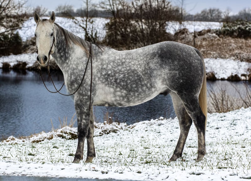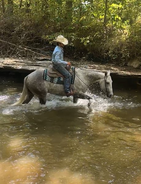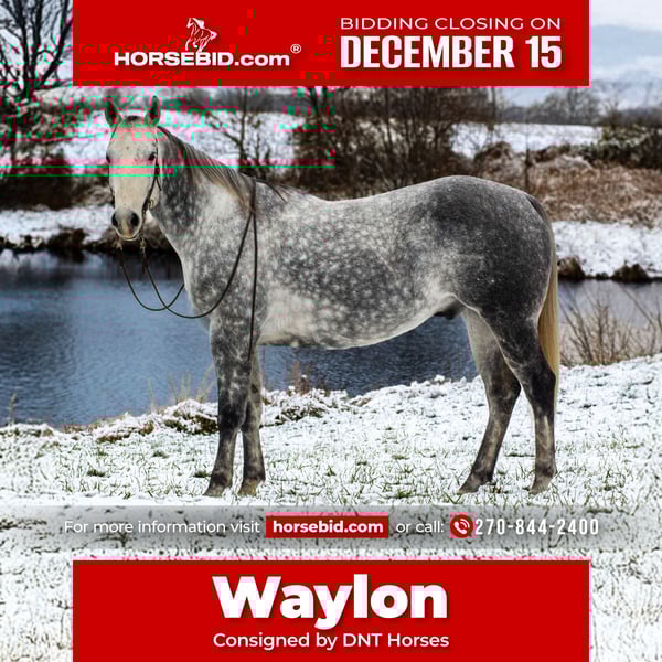 🎄𝐓𝐇𝐄 𝑯𝒐𝒍𝒊𝒅𝒂𝒚 𝐂𝐋𝐀𝐒𝐒𝐈𝐂🎄 Happening now thru MONDAY | DECEMBER 15th - Available EXCLUSIVELY on HorseBid's website! For more details and to register visit: www.Horsebid.com CONSIGNOR CONTACT: DNT Horses 270-844-2400 LOCATION: Henderson, KY BREED: Quarter Horse REGISTERED: No COLOR: Grey HEIGHT: 15.3 AGE: 7 GENDER: Gelding Waylon is a 7yr old grade quarter horse gelding standing at 15.3hh! He is a gorgeous dapple gray, with the sweetest personality! He is a dream to ride! He has a smooth trot and canter! He is very forgiving, and a great horse for all levels of riders! He is safe and dependable! Waylon moves nicely and listens to cues well! You can saddle him up and ride off or just hop on him bareback. He is as honest as the day is long and the same horse everytime you take him on a ride! We have taken Waylon to state parks on rides and overnight camping trips! He does great at new places and takes everything in stride! Waylon is great in all types of trail group settings, and will lead the pack or follow! He is remarkably surefooted, you can count on him to pay attention and navigate any terrain you put in front of him. He loves water and will cross creeks, steps over logs and doesn't mind the steep hills! He doesn't mind the traffic, heavy machinery and is used to being around dogs as well! Waylon has also turned back cattle, has been ridden all over the pastures checking yearlings and cow/calf pairs. He has been roping the sled and doing great. He is an all around sweet gelding and so fun to ride! Waylon also rides very well in the arena, he will pick up both leads, he stops and backs up! You can ride him on a lose rein and neck rein or he will direct rein as well! He is a very smart guy and adapts well to new riders! Waylon is one of the sweet and gentlest gelding you will meet! He is very affectionate and is the first to meet you at the gate, and will be a great asset to become a lifetime partner for the family! If you would like to schedule a time to come meet and ride Waylon, or have any other questions about Waylon feel free to reach out to Tasha at 270-844-2400. We are located in Henderson KY and can assist with transportation arrangements. Don’t let this amazing gelding get away from you if you are wanting something big, beautiful and dependable.