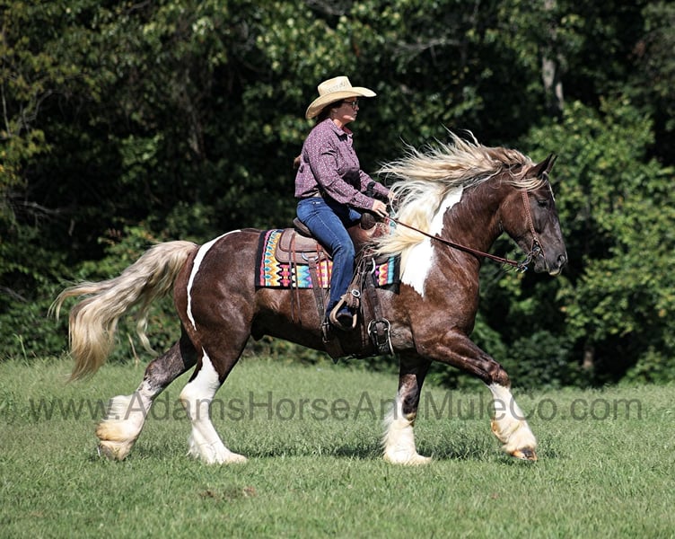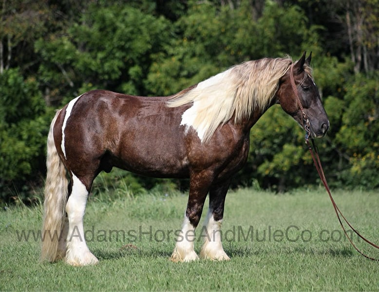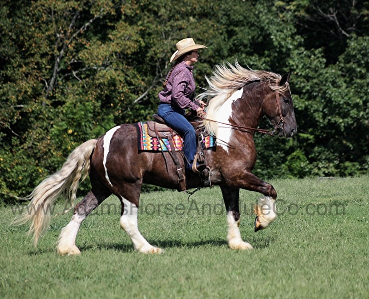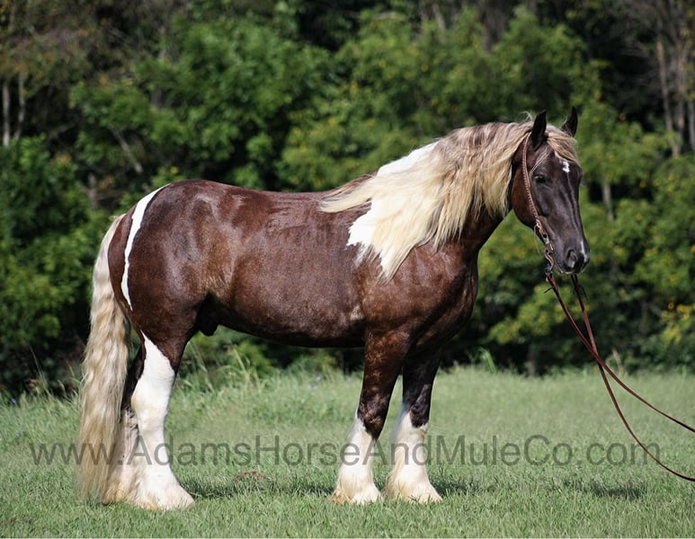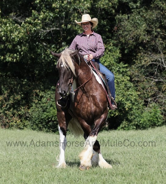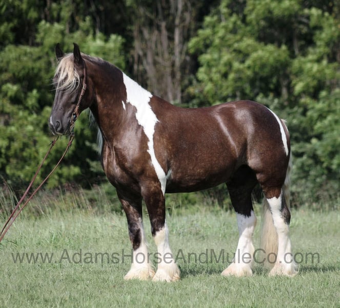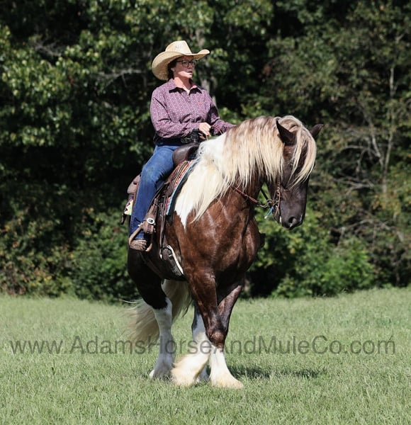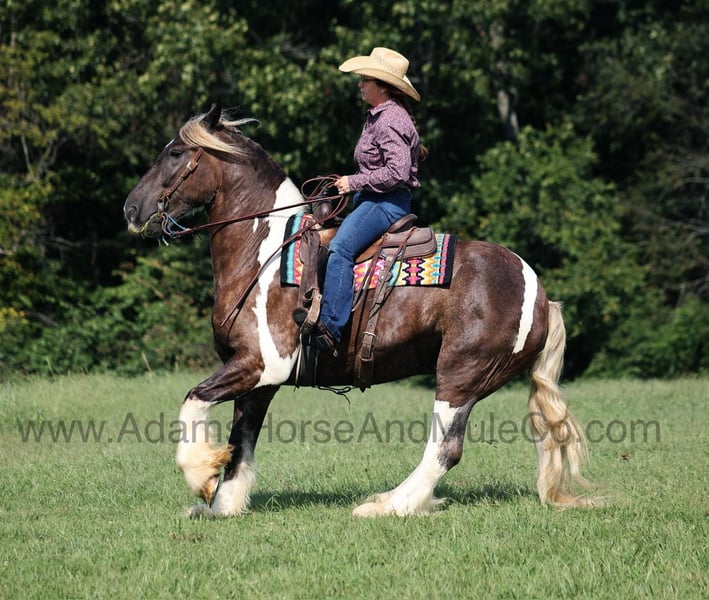 Go to www.AdamsHorseAndMuleCo.com for more pics and a video. AHAMC has been in the horse business and sold horses over the internet since 2005. We have a long track record of success with hundreds of happy customers. We work hard to match riders with the correct horses and specialize in beginner safe, family friendly horses that have been used and checked out by our family! This guy has the WOW factor!!! Kitkat is a stout built Gypsy Vanner Draftcross gelding standing 16.1h, he will weigh 1400lbs, he is 5 years old, and he is that super rare silver dapple paint color with big dapples on him. He is one cool looking guy! Not only does he look cool, he has all of the other boxes checked as well… he is Mr. Personality, as friendly as they come, loves attention and is very calm natured. KitKat is out of the same breeding program as several other top draftcross geldings that we have had over the last 4 years and every one of them has the right mind with the calm nature that makes them great family horses. KitKat has been in the program for the last two years and has completed the natural horsemanship training and does liberty work and he also knows some tricks, he will bow, and lay down. KitKat has been ridden by every member of our family all the way down to our 6 year old. He has been ridden down the highways and he is traffic safe as well. In addition to riding he also drives! KitKat is great on trails and he will cross creeks, ditches, logs and navigate rough rocky areas. He has a smooth jog, a VERY VERY nice easy to set lope, a good stop, turns a circle both ways and backs with ease! He has been exposed to all kinds of wildlife such as deer or turkey or other animals like cows or dogs and will go anywhere that he is asked too. He has been ridden many miles in the mountains and encountered every obstacle possible on the trail. He will go up or down even the steepest slopes, across deep creeks, over downed trees, and over all types of rough terrain while still being sure footed. KitKat is not cinchy, cold backed, does not crib or weave. KitKat is a once in a lifetime type of horse that will suit your family in every way!!! Feel free to call Eric 606-308-2461 with any questions.