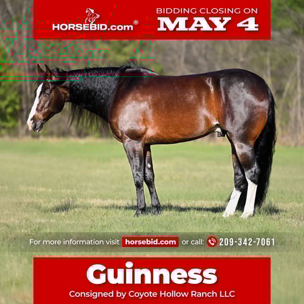 ▪️▫️◾️𝐭𝐡𝐞 𝑴𝒂𝒚 𝐒𝐞𝐥𝐞𝐜𝐭◾️▫️▪️ Happening now thru MONDAY | MAY 4th - Available EXCLUSIVELY on HorseBid's website! For more details and to register visit: www.Horsebid.com CONSIGNOR CONTACT: Coyote Hollow Ranch LLC 209-342-7061 LOCATION: Waco, TX BREED: AQHA REGISTERED: Yes REGISTERED NAME: LATE NIGHT WHIZKEY COLOR: Black HEIGHT: 15.3 AGE: 8 GENDER: Gelding Looking for a horse that does it all with a heart of gold? Meet Guiness, a seasoned gelding who is as talented as he is kind. Sired by the legendary Late Night Stopper, Guiness carries the bloodlines and the training to back them up. He was shown extensively in reining and handles all maneuvers with ease, making him a push-button ride in his circles, lead changes, beautiful stops, and smooth turnarounds. He is the perfect candidate for a Non-Pro or Youth rider looking to be competitive, and he would also excel in Ranch Riding classes. Beyond the show pen, Guiness is the ultimate partner for any discipline. We have roped off him and taken him on extensive trail rides, and he is steady, brave, and reliable outside the arena. He has been with us since we purchased him from his original owner, who raised him from birth. He stays gentle regardless of how much time off he gets—no lunging required—and he is excellent to shoe, haul, tie, and handle. Guiness is a barn favorite with a very personable nature, and we are looking for the perfect, loving home for him. He fits into any program and is ready to take his next rider to the next level. If you are looking for a reliable, talented, and kind-hearted horse, Guiness is the one. 📍 Located in: Waco, TX 📞 Serious inquiries only, please contact Chelsea at 209-342-7061. Nationwide shipping is available