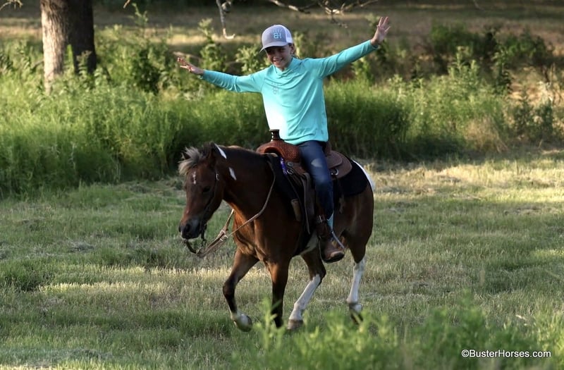 ONLINE AUCTION Place your bids at www.PlatinumEquineAuction.com Starting Bid $3500 Auction ends July 14th, 2024 Need a new saddle? Check out White Rock Saddles on our website or Facebook! Wreck It Ralph aka: “Ralph” is a 10.3H, 7 year old bay paint pony gelding. If you want your little ones to be able to grab one and go and have a great time and learn all on their own – this Ralph is your guy! This pony has the sweet-est kind-est nature, and a willing to work little attitude that makes it really fun for the kiddos. He is not your typical pony that you have to harass into doing everything. Ralph loves having a job, he loves to trot and lope circles, and he does everything he can to do what he’s asked all the time. He has an amazing natural big stop smooth gaits, and guides really well off your seat, legs and reins. He loves going out and checking the place and loves to herd the goats, and even the livestock that is bigger than he is! He rides out and leaves the barn very willingly with zero fuss, and he rides our happily alone or in a group. Ralph would be adorable at the little entry level hunter jumper shows, he is a cute little mover! He is also handy enough to be a ton of fun for kids at the playdays. He has just enough of a motor to not be frustrating for the little bitties to get him to go, but is not remotely hot, forward, or fraction, and he has super good brakes! This is the perfect balance everyone is looking for in a pony. He is very friendly and kind and always wants to be right up in your business and with you. This little guy is going to make a young kiddo very happy and make a rider out of someone. If you want your kids to ride and enjoy riding, get them a good pony you can turn them loose on to go pay with and be kids, and learn on, and enjoy. Ralph was just shod all the way around two weeks ago, his teeth were also done by an equine dentist last week, and he had his sheath cleaned, his ears treated for ticks, and he was also power packed wormed. He is good to shoe, has great feet and also goes well barefoot – if his new owner prefers him to be barefoot, we can have his shoes pulled and trim him prior to him heading to his new home. He will arrive at his new home up-to-date and ready to go to work! We are experienced, knowledgeable sellers, and we can help with quickly arranging affordable shipping to any buyer’s location – we have experience shipping worldwide – including regularly to Hawaii, Canada, Mexico, Europe, and South Africa. Please call Buster Horses Ashley 214-605-7174. ONLINE AUCTION Place your bids at www.PlatinumEquineAuction.com Starting Bid $3500 Auction ends July 14th, 2024 Need a new saddle? Check out White Rock Saddles on our website or Facebook!