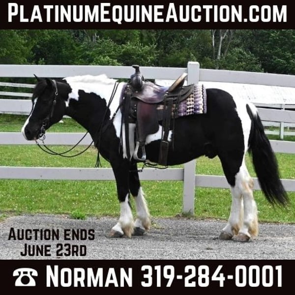 ONLINE AUCTION Place your bids at www.PlatinumEquineAuction.com Starting Bid $3500 Auction ends June 23rd, 2024 Need a new saddle? Check out White Rock Saddles on our website or Facebook! Meet Flash! Here is a one of a kind, guaranteed barn favorite! Flash stands a stout built, 14.1H and he is a 7 year old, Gypsy Cross Gelding. Flash is not only broke to ride but he also drives and will go anywhere that you point him. He has been driven down the highways, in busy traffic, though town, to the store… hes done it all! When it comes to riding, he is the very best horse! He will go down the trails with confidence, cross creeks, deadfall, go over rough terrain and scale steep slopes. Flash is a broke horse that adults can ride but absolutely safe and gentle for the little riders as well! He is a true confidence builder. Flash will walk , trot and canter. He lopes nice circles, takes the correct leads and has a good stop. He has a lot more WHOA than go so he is one that beginners and total novices can learn on. He has a ton of personality, he’s never met a stranger and will follow you like a dog. He is up to date on everything. He has been 100% sound and has never taken an off step. For more info call Silver Star Stables Norman 319-284-0001 Located in Sturgis, MI. ONLINE AUCTION Place your bids at www.PlatinumEquineAuction.com Starting Bid $3500 Auction ends June 23rd, 2024 Need a new saddle? Check out White Rock Saddles on our website or Facebook!