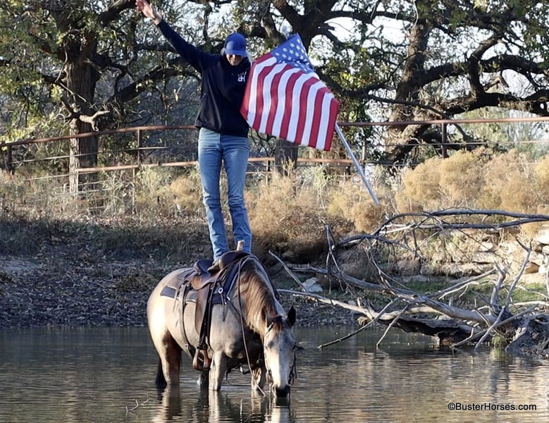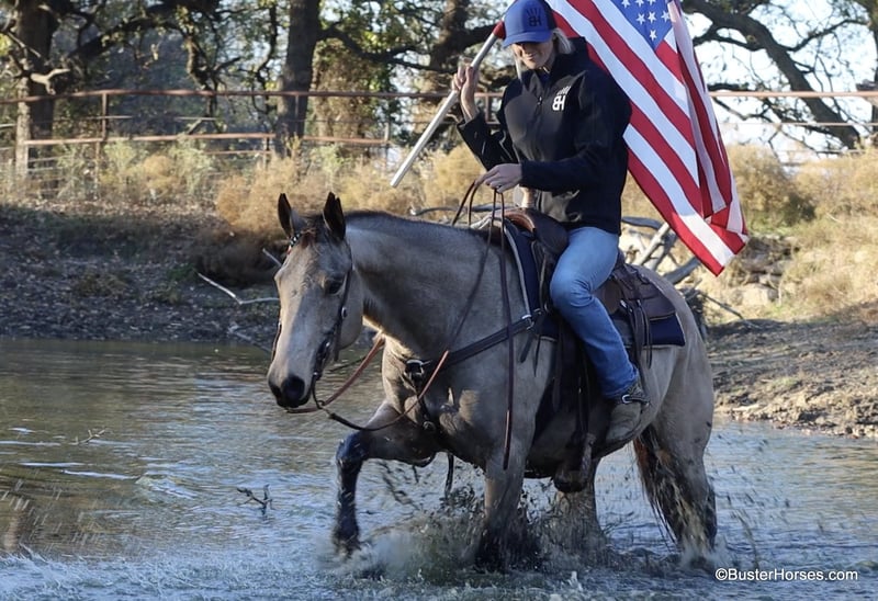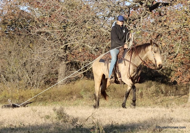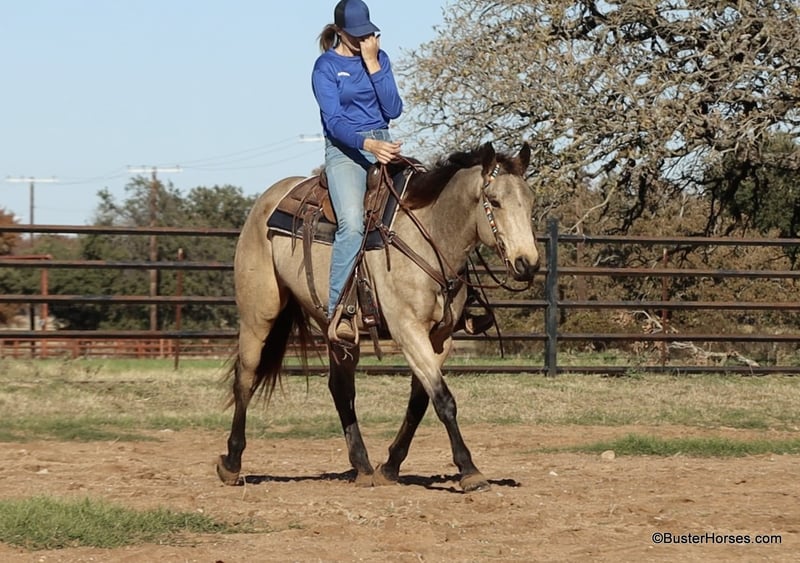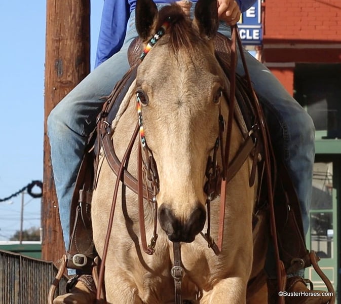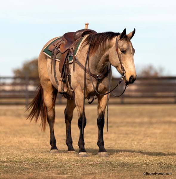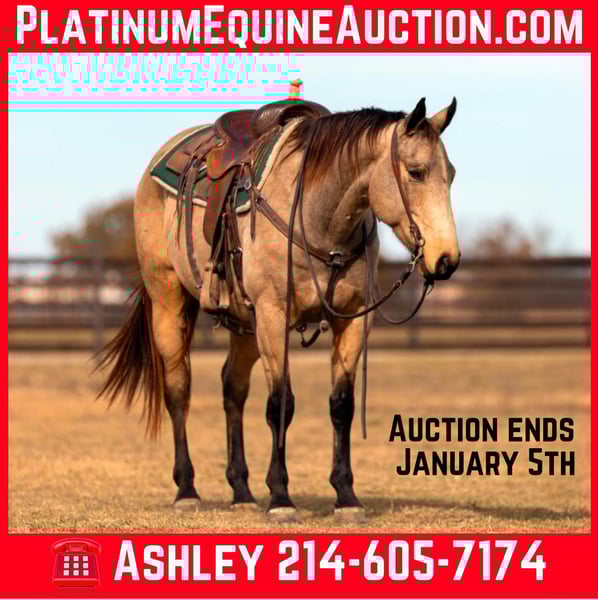 ONLINE AUCTION Place your bids at www.PlatinumEquineAuction.com Starting Bid $3500 Auction ends January 5th, 2024 Need a new saddle? Check out White Rock Saddles on our website or Facebook! Jackrabbit is a 2017 model gelding standing 15hh. He is a seasoned ranch gelding that has been all over – he’s been used on big ranches in New Mexico, Colorado, and in Texas – and he has done his job well with all different levels of riders on him. He is extremely smooth gaited and has the most tolerant kind take-care-of-you personality, he aims to please PERIOD in all situations. He has an incredibly solid, mature-beyond-his-years disposition. He is an own son of Dun It With A Twist and he is out of an old-school Genuine Doc Peponita Pine X Watch Joe Jack bred mare. This cool gelding got his name from his ridiculous endearing little/but large, can’t-help-but-love-em ears – they are unique and adorable!! He is like an all-terrain vehicle!!! He literally can go up, over, into, and through almost anything you point him at – and he does it gracefully, willingly, and boldly while still also being careful where he puts himself and his rider. He absolutely loves going into town, he genuinely enjoys seeing everything new and meeting the people. He hops right on the trailer and has absolutely no vices or bad habits. He will ride out alone willingly and has many many miles riding out in the open alone. He is easy to mount and dismount and is extremely uncomplicated to ride. He has a nice handle on him, you can ride him anywhere with one hand and he travels comfortably at all three gaits. He easily picks up either lead, has a great stop, back up, and turn around on him. He is naturally very balanced, low headed, and relaxed. He has worked more gates than you can count and knows his job there. He has sorted in the actual sorting pens for years, and would make a great horse for the sorting or penning competitions – he’s done that job in real life, for hours and hours for several days and he knows the deal! He has also been lightly started in the roping pen and is just the right age to start hauling and seasoning for that job. He does have some speed and run when you ask him, and would make a great all-around Junior, High School, or College rodeo horse. Has a ton of natural rate and stop, and plenty of cow – would quickly make a breakaway horse as well. He is a flat, level, and cute enough mover to also be very capable of playing around at the local entry level ranch horse competitions, or go to 4-H and be competitive. A gelding this versatile, athletic, seasoned – plus kind natured, and this perfect age – plus BUCKSKIN, is not a gelding we get every week. Come check him out anytime! Jackrabbit was just recently maintained by the chiropractor, the equine dentist, and was just shod by the farrier, wormed, and he has a fresh Coggins. We can quickly and easily get travel health papers drawn up anywhere you need him to go. He will arrive to his new owner with all cares in order and ready to do whatever job you have for him. Please feel free to reach out to us to come ride and try Jackrabbit, we would love to meet you in person and show him to you. We are conveniently located only an hour from a large centrally located international airport, making coming to see him possible no matter where you live! Please check out Buster Horses / Buster Ranch our past customer reviews on Google, Facebook, and our own website. And please go to Jackrabbit’s web page for more information, pictures, and for additional videos: BusterHorses.com/Jackrabbit We are located in Weatherford, TX. Call Buster Horses Ashley 214-605-7174 with any questions. ONLINE AUCTION Place your bids at www.PlatinumEquineAuction.com Starting Bid $3500 Auction ends January 5th, 2024 Need a new saddle? Check out White Rock Saddles on our website or Facebook!