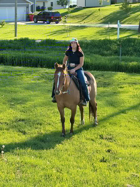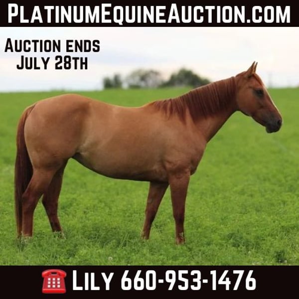 ONLINE AUCTION Place your bids at www.PlatinumEquineAuction.com Starting Bid $3500 Auction ends July 28th, 2024 Need a new saddle? Check out White Rock Saddles on our website or Facebook! “High Brow Ritarae” 2017 Model red dun mare. I have owned Riata since she was a long yearling. I had 20 days put on her before I started riding her on my own when I was 9 years old, she was my first big horse to finish on my own. I have spent countless hours riding her through the trails, swimming in the pond, gathering livestock, roping cattle, barrel racing and pole bending at jackpots, hauling her to rodeos all over Missouri, Kansas, Iowa. We have competed at Green Hills Horse Show, local fun shows, rode in parades, competed in cattle sorting, I have done about everything there is with Riata and she has taken care of me every time. She has been used on our farm for lessons, guided rides, riding clinics. She will take care of her rider, she doesn’t spook, she can sit for weeks and ride off like she never missed a day. You don’t have to worry about her acting up or misbehaving, she saddles up good and rides off like one should. She has a ton of heart and will give you her best every time you ride her. I have a few others horses and have been getting busy in high school now so I am going to offer her to public, so she can be used and rode like she deserves to be. I turn 16 in a few months and need to buy a car. She will be somebody’s dream horse, I truly believe. She is very versatile. She has won me many paychecks in barrel racing, and at local horse shows. She is finished 2D barrel horse, I believe if she was hauled consistently she has room to improve. She has been rode in all the show classes and speed events as well. She is 100% sound, she has never had any maintenance other than normal routine worming, teeth, farrier work. She rides barefoot and has good hard feet, she can be shoed if you prefer. She stands for the farrier, she stands tied, she loads in various types of trailers, she will back out of trailer, she has been hauled all over the place, new places don’t phase her, she walks on the hot walker. She rides bareback with a string around her neck, halter, it doesn’t matter she is handy broke, neck reins around and easy to maneuver. She rides alone or in a group, this is one of my favorite things about her. She is not marish around other horses, she has good manners on the ground and in the saddle. Riata loves working cattle, she is used to checking cattle out in the pasture, gathering cattle, roping cattle and she loves every minute of it. She would make somebody a very nice breakaway horse! I would be glad to show you Riata and let you take her for a ride. I want her to go to a loving home and be a good fit for her new owner, she is very deserving of it! She is located in Princeton, MO. Shipping can be arranged anywhere in the US. Lily Stark 660-953-1476. ONLINE AUCTION Place your bids at www.PlatinumEquineAuction.com Starting Bid $3500 Auction ends July 28th, 2024 Need a new saddle? Check out White Rock Saddles on our website or Facebook!