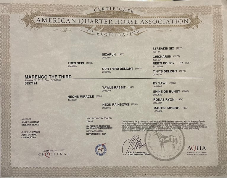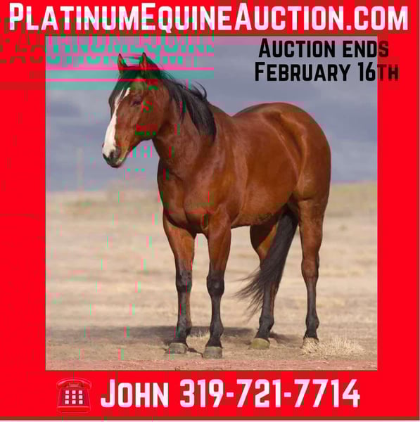 ONLINE AUCTION Place your bids at www.PlatinumEquineAuction.com Starting Bid $3500 Auction ends February 16th, 2025 Need a new saddle? Check out White Rock Saddles on our website or Facebook! Marengo The Third is a Handsome, Talented, and Versatile Bay Gelding with an exceptional pedigree going back to Streakin Six!!! Marengo is a 2017 model, 15-hand bay gelding and is bred for performance. He earned approximately $13,800 on the racetrack at Remington Park, Oklahoma, and has since transitioned successfully into barrel racing, having been hauled to numerous jackpots, NBHA shows, and open rodeos. Key Highlights: • Runs to the left and is extremely automatic in the pattern • Fast, talented, and versatile—excels both inside and outside the arena • Proven trail horse, unfazed by challenging terrain and large parks/rivers • No spook, no buck, and impeccable ground manners • Used as a turnback horse—cowy and quiet in a herd • Lesson horse for the past year, making him an ideal step-up mount Marengo is up-to-date on all shots, vaccinations, and shoeing. He hauls, clips, and bathes with ease and stands perfectly for the farrier, saddling, and bridling. Whether living outside on his own, in a group, or stabled, he adapts well and stays on feed while traveling. He sells sound in mind & body with no bad habits or gate issues. For more information, call or text John McPhail 319-721-7714 Located in Lisbon, IA. ONLINE AUCTION Place your bids at www.PlatinumEquineAuction.com Starting Bid $3500 Auction ends February 16th, 2025 Need a new saddle? Check out White Rock Saddles on our website or Facebook!