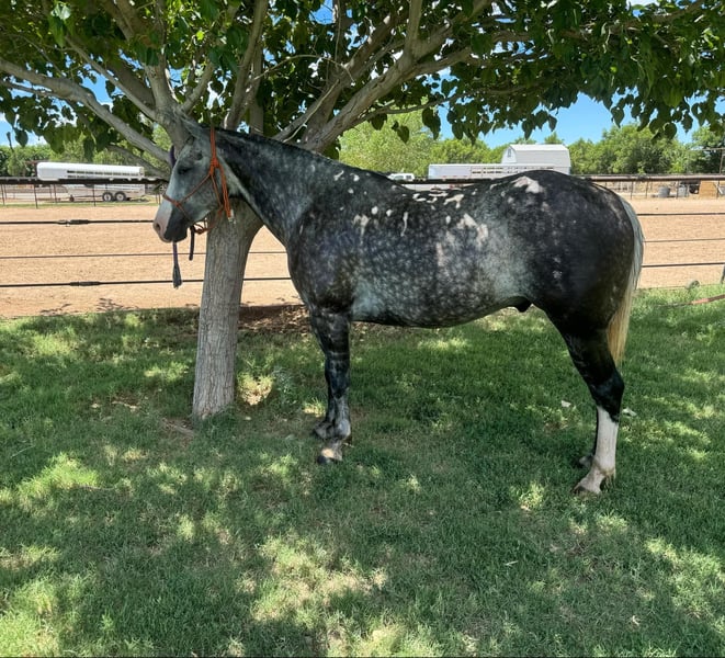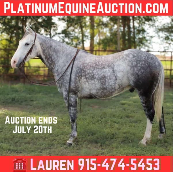 ONLINE AUCTION Place your bids at www.PlatinumEquineAuction.com Starting Bid $3500 Auction ends July 20th 2025 Need a new saddle? Check out White Rock Saddles on our website or Facebook Snoop is the absolute all around family horse! He is 8 years old and has been with us for 2 yrs now. He’s been trail road and ranched on in west Texas . He’s as solid as they come. He’s a very reliable using horse that will get a cowboys job done or be a family horse and cruise down the road for an evening trail ride. Snoop is 15h tall he’s built like a bulldog quarter horse wide,stocky, big hip with a little head. He’s got the coolest dark dappled grey color. He’s for dappled size as apples! To top it off he has the personality to match his color absolutely unique and special, wants to be your friend . We’ve used him in extensively on the ranch from rounding cows up or pushing steers up at the roping practices or checking fences. He’s also solid on the heel side, he’s good in the box and will really watch a cow and rate off, he’ll be strong to the horn. He knows his leads, he will lope big pretty circles. He’s been around the barrels, flags, tarps, traffic, he’s absolutely safe for any level rider will be safe everyday of the week and 100% reliable. He is easy to shoe, saddle , bathe , load and haul with no issues. He will be straight legged no bumps or blemishes and 100% sound. If you are looking for your next family horse snoop is your guy don’t miss him. Located in El Paso, TX. Contact Lauren Lara 915-474-5453 with any questions. ONLINE AUCTION Place your bids at www.PlatinumEquineAuction.com Starting Bid $3500 Auction ends July 20th 2025 Need a new saddle? Check out White Rock Saddles on our website or Facebook