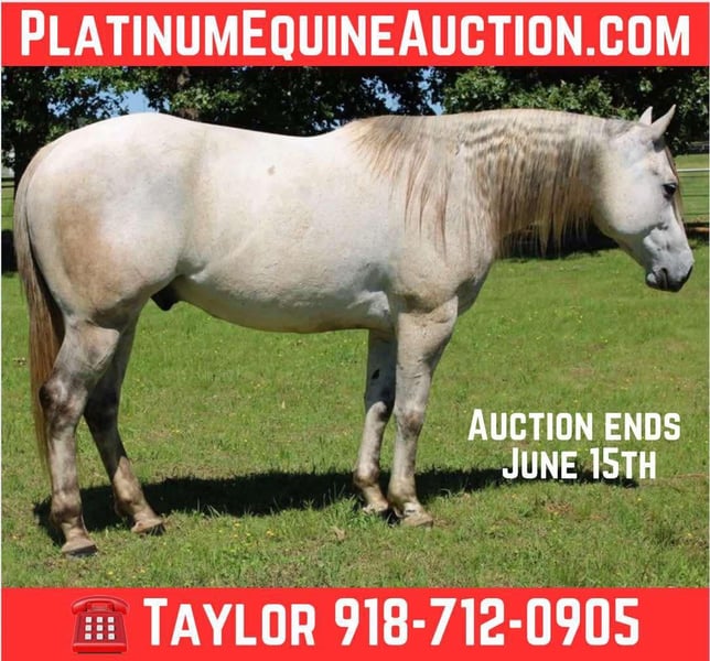 ONLINE AUCTION Place your bids at www.PlatinumEquineAuction.com Starting Bid $3500 Auction ends June 15th, 2025 Need a new saddle? Check out White Rock Saddles on our website or Facebook! Bodee is a 2017 prime aged, AQHA registered, grey, gelding that will stand 15 hands and has tons of bone and substance to last you a lifetime! He is stout, big boned, with solid, sturdy feet! Bodee has experienced a little bit of everything making him well-rounded and versatile. In the arena, Bodee has a smooth walk, trot and lope in perfect circles. Has a great stop, moves off your legs and backs up when asked. He is great on the trails, will cross water, logs, and bridges! Bodee will ride solo, or with a group, not much phases him! Bodee has been used all over the ranch to sort, doctor, load trucks and he has been used the past week dragging calves! He is easy to catch in the pasture, he sees you and he comes running! Bodee is good to saddle, bridle and mount! He stays collected and has a short lope that you can sit all day. Bodee is a nice young gelding that would make an outstanding rope horse, or look great out on the trails! He is a true quality ranch horse, trail horse, show horse, or performance horse. Bodee is 100% sound, straight and correct in every way! Up to date on vaccines, worming, and coggins. We are located in Sallisaw, OK. If you have any questions or concerns, please call Taylor at 918-712-0905. If you have any questions regarding transport, please reach out! I am more than happy to assist you in setting up dependable shipping no matter where you are! ONLINE AUCTION Place your bids at www.PlatinumEquineAuction.com Starting Bid $3500 Auction ends June 15th, 2025 Need a new saddle? Check out White Rock Saddles on our website or Facebook!