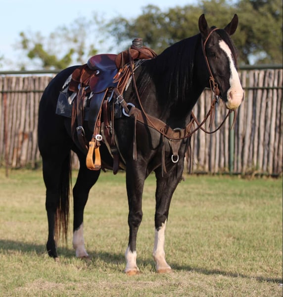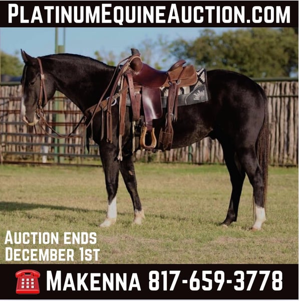 ONLINE AUCTION Place your bids at www.PlatinumEquineAuction.com Starting Bid $3500 Auction ends December 1st, 2024 Need a new saddle? Check out White Rock Saddles on our website or Facebook! The first thing people notice about Groot is that he’s simply gorgeous. He is shapey with a big soft kind eye and he has a cool ranchy look about him that always gets attention. He’s also a perfect size, easy to mount with great substance and presence, along with sturdy bone allowing him to go all day long. But Groot is not just another pretty face. This guy does it all. He has been all over the country. As a result, Groot has been exposed to everything under the sun. He ropes and holds cattle for doctoring; sorts and pushes cattle, gate sorts and moves pairs; and is slowly started on the smarty on the head side. With this horse and a good stock dog, you can load a pot full of cattle all by yourself. He is brave, confident, handy, and athletic. He’s also not all work and no play. Groot has all the skills to be your best trail buddy or family horse. He will cross water, go over logs, through deep brush, and navigate bridges without having to ask him twice. He rides out alone or in a group with impeccable manners. He will tolerate any human shenanigans trail riding may bring out. In a saddle or bareback, he doesn’t care. Completely unbothered around dogs, vehicles, farm equipment and UTVs, even when they invade his personal space. Groot is a beautiful mover with easy transitions from walk-trot-lope/canter. Stops on a dime, has a cute turnaround on him. Broke like one should be. Loads and unloads without drama. You can pick up all 4 feet easily. Good in a stall or in a pasture with other horses. He stands 15.1hh tall and weighs 1200lbs and just 7 years old! This horse is one in a million and we want him to find a one in a million home! Located in Lipan Texas We can help arrange hauling anywhere in the US, Hawaii or Canada! Please call or text Makenna Hartzell 817-659-3778. ONLINE AUCTION Place your bids at www.PlatinumEquineAuction.com Starting Bid $3500 Auction ends December 1st, 2024 Need a new saddle? Check out White Rock Saddles on our website or Facebook!