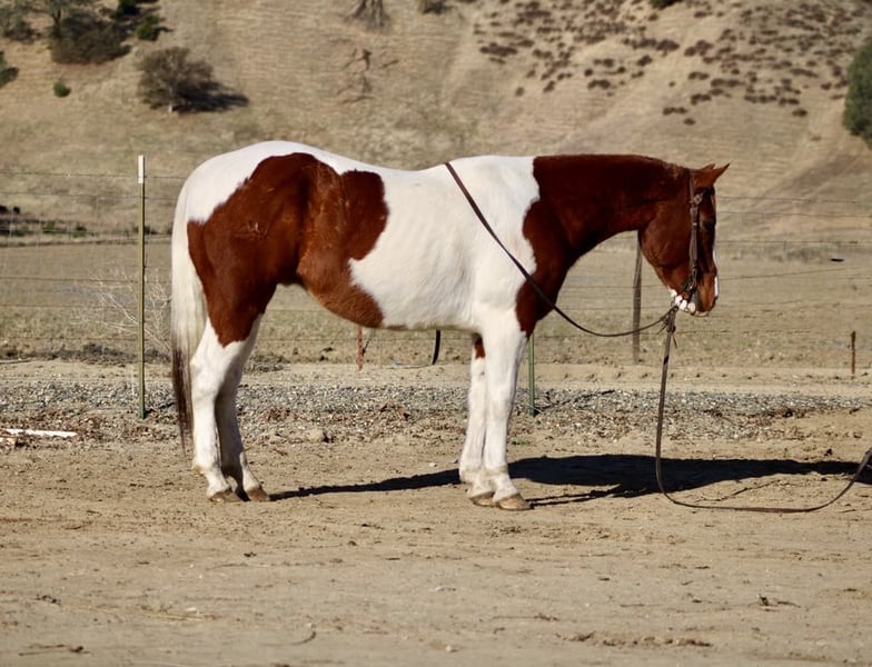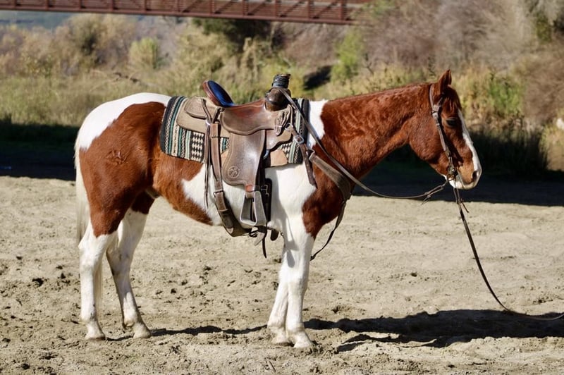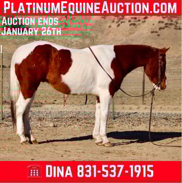 ONLINE AUCTION Place your bids at www.PlatinumEquineAuction.com Starting Bid $3500 Auction ends January 26th, 2025 Need a new saddle? Check out White Rock Saddles on our website or Facebook! Checkers is an adorable sorrel and white paint gelding, standing at 14.3 hands and is 8 years old. Checkers has spent many miles as a trail horse, and you can really see it in how confidently he navigates any terrain. He’s super sure-footed and will follow any trail you point him at, whether it’s steep hills or crossing water he handles it all like a champ! Checkers has seen the hustle and bustle of congested traffic and has been ridden down old country roads where he has encountered barking dogs,cyclists and pedestrians! In the arena, he has a nice, easy pace. He walks, trots, and picks up his leads and has nice smooth circles, and a nice sliding stop making him safe for riders of all levels. Plus, he’s been used for checking cows and gathering pastures, he’s fun and easy to ride out. Checkers loves trying new things too! He’s been tackling obstacles without a hitch, calmly crossing tires, bridges, and pool noodles. He’s just the best! Whether you want to ride alone or in a group, he’s your guy. He hauls well and travels like a dream. He is great in the pasture gets along well with other horses and will be just as comfortable in a stall setting. He ties well stands patiently while being groomed and tacked up. He is one of the easiest horses he’s safe, dependable, and just has this easy-going vibe that makes him a joy to be around. If you’re looking for a fantastic partner for some adventures, Checkers is definitely the one! You should reach out to Longhorn Ranch in Paicines, CA, and ask for Dina at 831-537-1915 to meet this special boy. You won’t regret it!