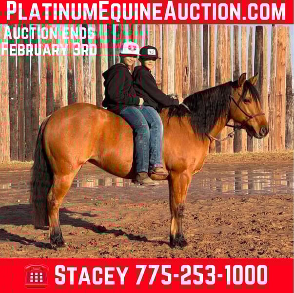 ONLINE AUCTION Place your bids at www.PlatinumEquineAuction.com Starting Bid $3500 Auction ends February 3rd, 2025 Need a new saddle? Check out White Rock Saddles on our website or Facebook! Here is an all around mare that the whole family can enjoy! From a hard days work, to a playday, to a fun and relaxing trail ride, she is your go to girl. Lady is a beautiful dun mare who is so much prettier in person than she is in a picture. She is 8 years old, stands 14.1-14.2 hands, and is built like a brick house! Lady is an outstanding horse that has the best mind and temperament you could ask for. Perfect ground manners, easy to catch, groom, saddle, and wears a size 74 blanket come winter time. Lady has been used for everything under the sun! She has been used at the cow sale to move cattle up and down the alleys, have doctored some cattle outside on her, gathered cattle off wheat fields and MOST importantly, she has been a solid all around horse for a woman rider and kids. The kids have walked and trotted her through the playday events with no issues. She’s got a willing attitude and a great handle with lots of try, point her though an event and go, even if she’s never done it before! Lady rides bareback, will ride in a halter just as good as a bit, and rides quiet and easy without any issue. If you watch the video, you’ll see her ride without a bridle. You can literally ride her anywhere with just a string around her neck. Lady is truly a one of a kind horse that is very broke and great minded, and will always handle whatever you throw at her at any time. Short enough to make it easy to mount and dismount for some of us who are older, or smaller kids, but stout enough the cowboys can go use her and do the hard work as well. This mare is absolutely gorgeous in person, with a heart of gold that always aims to please. She is safe and reliable always, and a pleasure to own! Contact Red Lock Ranch 775-253-1000 Located in Dublin, TX. ONLINE AUCTION Place your bids at www.PlatinumEquineAuction.com Starting Bid $3500 Auction ends February 3rd, 2025 Need a new saddle? Check out White Rock Saddles on our website or Facebook!