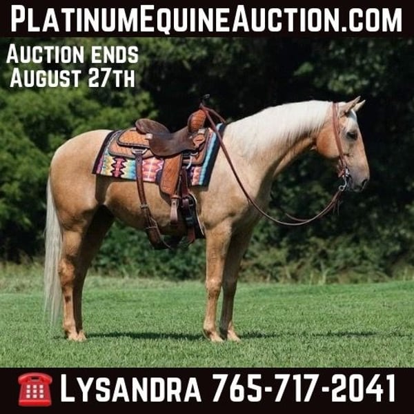 ONLINE AUCTION Place your bids at www.PlatinumEquineAuction.com Starting Bid $3500 Auction ends August 25th, 2024 Need a new saddle? Check out White Rock Saddles on our website or Facebook! A Zans Olen Jack is a stout built Golden Palomino Gelding. He is standing 15.1hh and he is a 2017 Model Registered AQHA Gelding. He is well bred going back to Zan Parr Bar and is a rare find with Two Eyed Jack still listed on his pedigree. Zan is a do it all kind of horse! He can go out and hit the trails and just cruise along slow and easy. He rides with his head low and will keep a loose/draped rein. He has been exposed to all kinds of wildlife. He will go up or down steep slopes, across deep creeks, over downed trees, and over all types of rough terrain while still being sure footed. He has been ridden through town and is safe in traffic is not spooky. He has been started on the roping dummy and is doing a good job tracking it. He knows his way around the ranch and has plenty of cow sense. He has a smooth jog, a VERY VERY nice easy to set lope, a good stop, turns a circle both ways and backs with ease! Zan is an excellent horse for anything from trail to ranch work and is pleasure to be aorund! We are located in Brodhead, KY. Feel free to call Lucky 13 Equine Lysandra 765-717-2041 with any questions. ONLINE AUCTION Place your bids at www.PlatinumEquineAuction.com Starting Bid $3500 Auction ends August 25th, 2024 Need a new saddle? Check out White Rock Saddles on our website or Facebook!