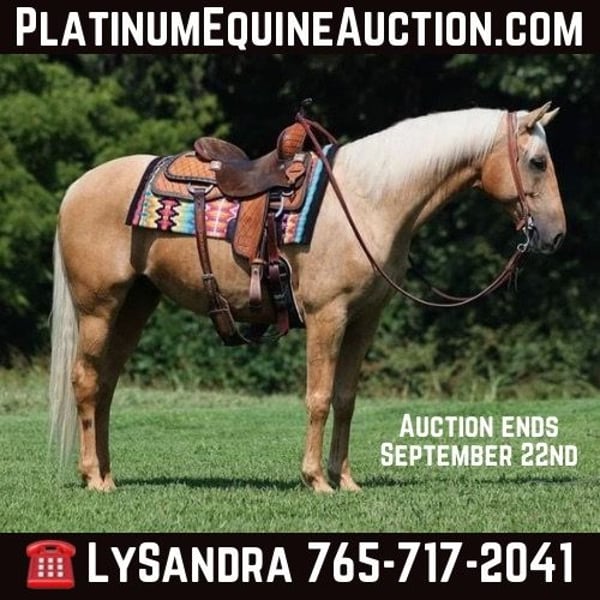 ONLINE AUCTION Place your bids at www.PlatinumEquineAuction.com Starting Bid $3500 Auction ends September 22nd, 2024 Need a new saddle? Check out White Rock Saddles on our website or Facebook! A Zans Olen Jack is a stout built Golden Palomino Gelding. He is standing 15.1hh and he is a 2017 Model Registered AQHA Gelding. He is well bred going back to Zan Parr Bar and is a rare find with Two Eyed Jack still listed on his pedigree. Zan is a do it all kind of horse! He can go out and hit the trails and just cruise along slow and easy. He rides with his head low and will keep a loose/draped rein. He has been exposed to all kinds of wildlife. He will go up or down steep slopes, across deep creeks, over downed trees, and over all types of rough terrain while still being sure footed. He has been ridden through town and is safe in traffic is not spooky. He has been started on the roping dummy and is doing a good job tracking it. He knows his way around the ranch and has plenty of cow sense. He has a smooth jog, a VERY VERY nice easy to set lope, a good stop, turns a circle both ways and backs with ease! Zan is an excellent horse for anything from trail to ranch work and is pleasure to be around! We are located in Brodhead, KY. Feel free to call Lucky 13 Equine Lysandra 765-717-2041 with any questions. ONLINE AUCTION Place your bids at www.PlatinumEquineAuction.com Starting Bid $3500 Auction ends September 22nd, 2024 Need a new saddle? Check out White Rock Saddles on our website or Facebook!