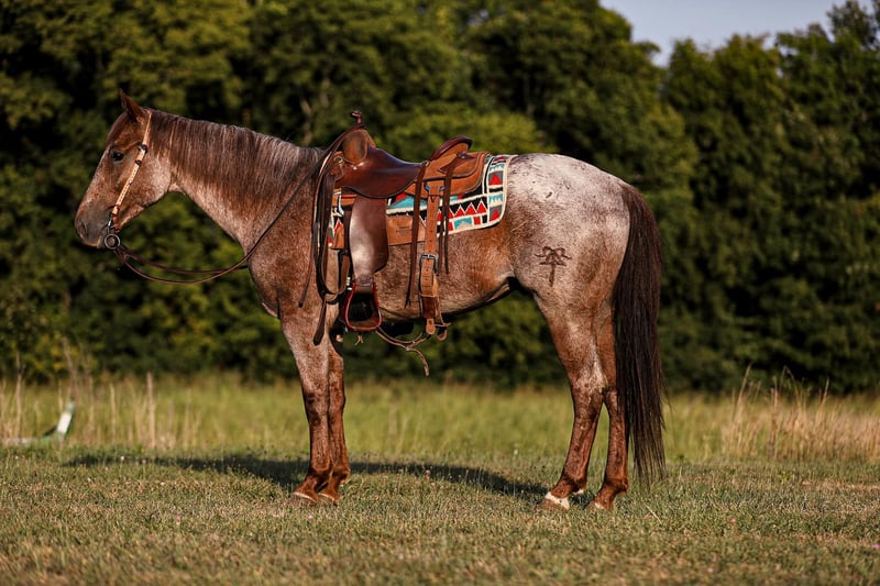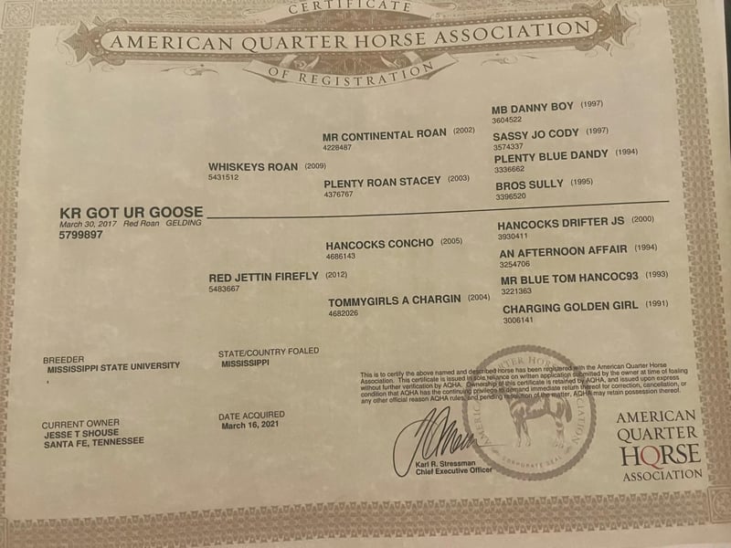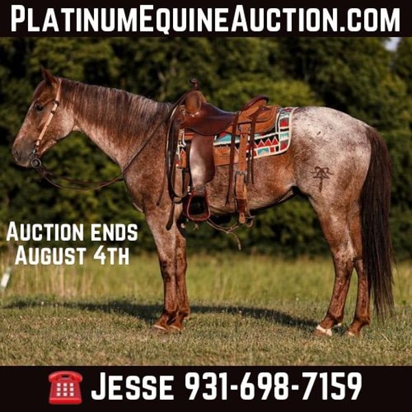 ONLINE AUCTION Place your bids at www.PlatinumEquineAuction.com Starting Bid $3500 Auction ends August 4th, 2024 Need a new saddle? Check out White Rock Saddles on our website or Facebook! KR GOT UR GOOSE is a 15.1h, 2017 model AQHA gelding. Goose is an all-around ranch / Trail horse combo that’s as pretty and well-mannered as they come. I’ve had the pleasure of owning and using him daily for the better part of 2 years now. Goose has been used out in the pasture catching and doctoring, trail ridden literally 1000s of miles by every level of rider you can imagine. He has worked at multiple sale barns penning and loading, and been on the occasional wagon train. I’ve used Goose a substantial amount out in the pasture, and no matter how tight of a situation you put him in, he will always stay with you. Goose has also been in the rough country of Wyoming on some of the toughest terrain and handles it all with ease. I have been fortunate enough to have him as my “go to horse” and he’s never let me down. From tied off working the slack, to keeping a high headed momma off of me, or taking the kids for a fun night ride he has done his job with me and is ready for his next partner. Located in Santa Fe, TN. Contact Jesse Thomas 931-698-7159. ONLINE AUCTION Place your bids at www.PlatinumEquineAuction.com Starting Bid $3500 Auction ends August 4th, 2024 Need a new saddle? Check out White Rock Saddles on our website or Facebook!