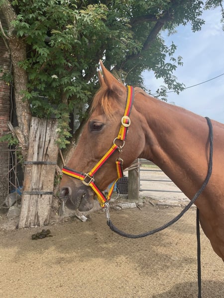 Im Auftrag Zum Verkauf steht die charmante American Saddlebred Stute Harlem’s Shirin Soulqueen. Wie der Name schon sagt, stammt Sie aus der Familie der Harlem‘s. Stammbaum wurde aber nie beantragt und auch nicht eingetragen. Shirin ist 15 Jahre alt (geb. Juni 2010), Fuchs, und hat ein Stockmaß von ca. 1,55 m. Sie ist eine absolut geländesichere Stute, da sie ausschließlich im Gelände geritten wurde. Sie geht alleine, wie auch in der Gruppe ins Gelände. Dabei zeigt sie sich stets brav, zuverlässig und nervenstark. Eine tolle Partnerin für entspannte Ausritte und Reiter, die Wert auf Vertrauen und Ruhe legen. Sie wird gebisslos geritten (Gebiss kennt Sie nicht). Shirin kennt Straßenverkehr (Autos und Traktoren/Weidemann) und kennt jegliche Art von Tieren (Hunde, Katzen, Schafe, Ziegen, Hühner und Kühe, nur schwarz/weiße Kühe sind gruselig) Im Umgang ist sie brav, aber hibbelig. Angebunden sein mag Sie nicht so gerne, da kann es vorkommen, dass Sie auch mal geht. Der ein oder andere Strick musste schon drunter leiden. Anhänger fahren, mag Sie auch nicht so gerne. Shirin besitzt einen Equidenpass. Sie ist regelmäßig alle 8 Wochen beim Schmied, regelmäßig geimpft (Tetanus und Influenza) und entwurmt (3-4x im Jahr). Shirin war bis dato immer kerngesund. Sie steht im Winter von morgens bis abends auf einer großen Wiese (mit Heu) und nachts in der Box. Im Sommer steht Sie 24 Stunden auf der Wiese. Shirin ist kein Anfänger-Pferd!!! Shirin wird inklusive komplettem Zubehör abgegeben (Sattel, Zaumzeug, Decke,…) Bei Interesse oder weiteren Fragen gerne melden Ein Probereiten ist nach Absprache möglich. Shirin steht in einem Stall in Düsseldorf-Knittkuhl.