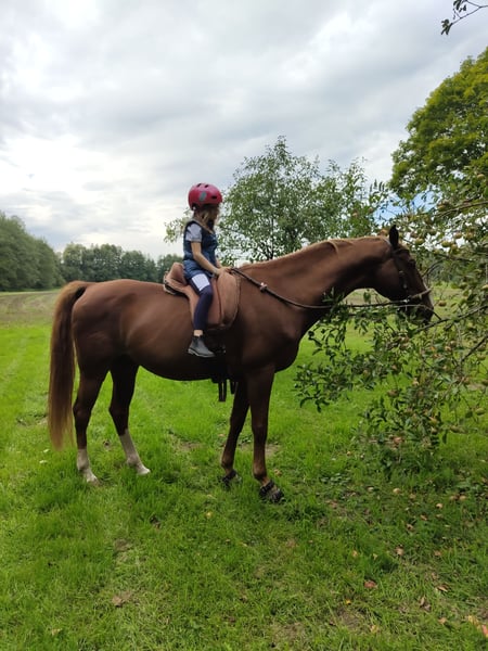 Shining ist ein 17 Jahre alter Saddlebred Wallach. Seit 5 Jahren ist er als Reittherapiepferd für Kinder bis 12 Jahren im Einsatz und macht dabei eine unglaublich schöne Figur. Er wird gebisslos und mit einem Physio Reitpad geritten. Er mag Platzarbeit lieber als Ausritte. Außerdem hat er 4 Gänge und kann einen ausladenden Showtölt gehen . Regelmäßige Zahnarztbesuche und alle 6 Wochen Barhufpflege bekommt er auch. Im Sommer trägt er vorne gerne Hufschuhe an. Er ist aktuell als Reitpferd für schwerere Erwachsene nur bedingt geeignet, da er einen langen und etwas instabilen Rücken hat, der erst wieder auftrainiert werden muss, wenn er gesund mehr als 60 Kg tragen soll. Er ist vom Boden sehr zuverlässig zu händeln, fast nicht zu erschrecken, obwohl er schon ein kleinerer Ferrari sein kann. Ein klassisches Showpferd eben. Er wird nur in die besten Hände abgegeben. Das bedeutet für mich einen Menschen oder Familie, der/die viel Liebe, Zeit und Geduld hat. Und nur in einen großen Offenstall, am besten mit Paddocktrail. Eine kleine, ruhige Herde reicht ihm. Er kann problemlos mit Stuten gehalten werden. Was er nicht mag ist Hänger fahren. Allerdings haben wir dieses Thema in den letzen Jahren nicht weiter behandelt. Wer also ein Kinder/Therapie/Show/Familienpferd sucht: meldet euch :)