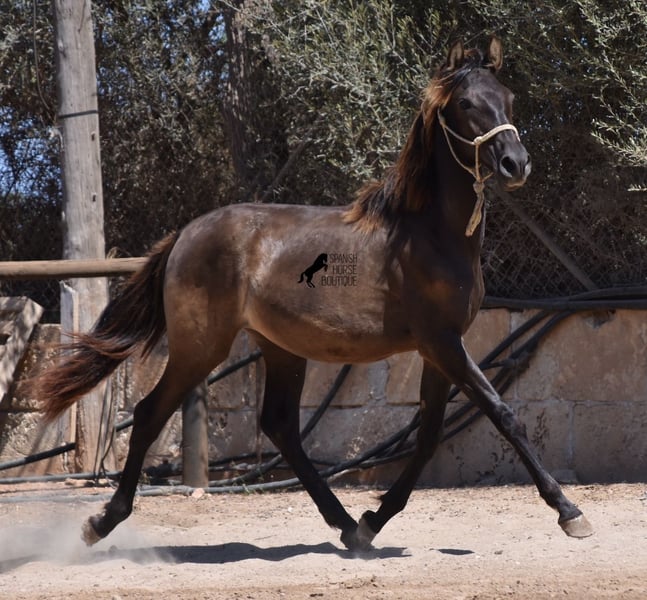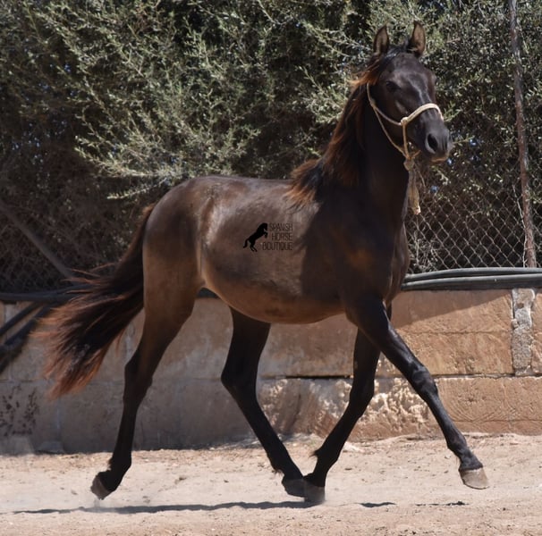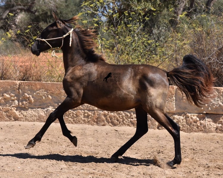 Questo stallone PRE nato ad aprile 2023 (Andaluso con certificato di razza ANCCE) è ancora una piccola sorpresa dal punto di vista del colore! È registrato come morello dall'ANCCE, ma mostra anche segni di essere un baio scuro. Poiché il test del colore non è stato effettuato e essendo figlio di un perlino, potrebbe essere uno smoky black o un baio scuro. In ogni caso: bellissimo! E per chi non vuole sorprese, è possibile richiedere un'analisi del colore ;) Il giovane sorprenderà non solo per il suo colore, ma anche per il suo movimento! Le sue lunghe gambe scivolano con grazia sul terreno e ama davvero trottare. È assolutamente impavido e tranquillo, il che ha reso difficile scattare buone foto, ma è una grande dimostrazione del suo carattere. Un giorno diventerà un uomo grande e forte, quindi deve avere un carattere coraggioso adeguato. Vive in condizioni rustiche, all'aperto 24 ore su 24 in compagnia di altri maschi, ed è quindi ben socializzato e temprato. La sua discendenza, oltre ai molti colori speciali come perlino, baio e morello, è di tutto rispetto. Discende dal popolare stallone Mejorante Remache XIII e ha anche sangue Escalera nei suoi geni. La sua altezza finale prevista è di circa 160 cm. Un giovane cavallo molto interessante, con grandi qualità a un prezzo molto equo. Si trova a Maiorca. È possibile lasciarlo più a lungo per l'allevamento presso l'allevatore. Video e genealogia disponibili su richiesta. Sono felice di organizzare in loco una visita veterinaria, il trasporto o anche il vostro viaggio, se desiderate venire a vederlo di persona. Dettagli disponibili sulla mia pagina o durante la conversazione. Saludos dalla Spagna.