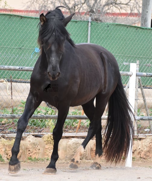 Hardly any other stallion has had as much success and is as famous as a Spanish dressage horse as POETA DE SUSAETA! And that is the sire of this baroque beauty, who has clearly also inherited good movement. This purebred Pura Raza Española stallion (Andalusian with ANCCE breed certificate), born in summer 2021, also has an excellent pedigree on his dam's side. There we find the Mejorante stallion NERO II and the ELITE stallion Inedito, both of whom are also great horses in the dressage world of the Spanish horse. And although the pedigree is very sporty, this youngster is beautifully compact and baroque, which makes him even more special. Plus the beautiful black coat and the lovely eyes - what more could you wish for? He has not yet been broken in, as it is important to the breeder that his horses have time to grow and are not overtaxed. This pays off, because the stallion is absolutely people-friendly, deeply relaxed, cuddly and a great guy all round. He lives next to mares, which doesn't interest him at all ;) He currently measures 159 cm and will grow a little more. He is barehoofed, lives in a stable and there is the possibility that he will be gelded and/or ridden on site. He is currently on Mallorca! Videos and pedigree available on request. A top horse at a very fair price. I would be happy to organize an AKU, riding, transport or even your trip if you come to see him in person. Details can be found on my website or in conversation. Saludos from Spain