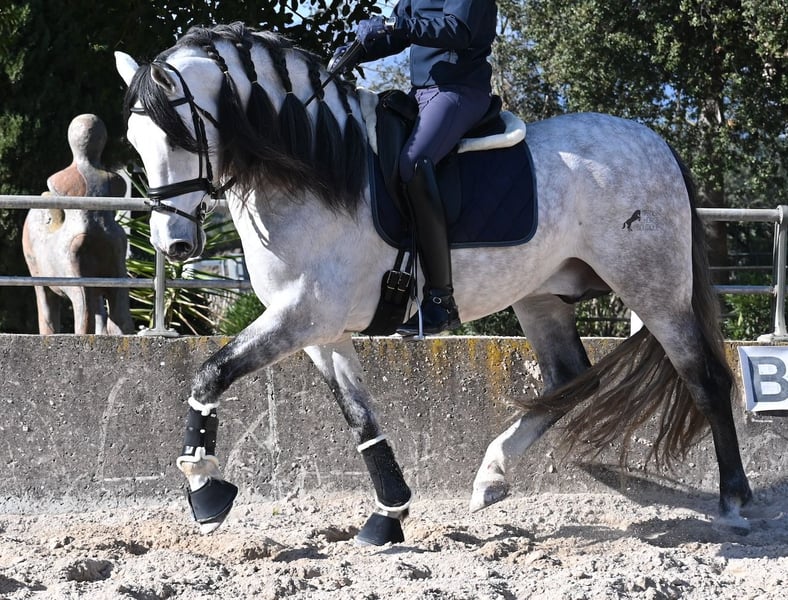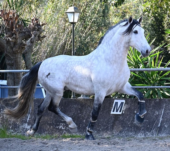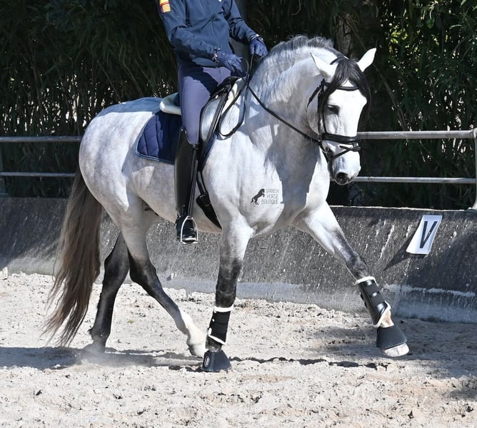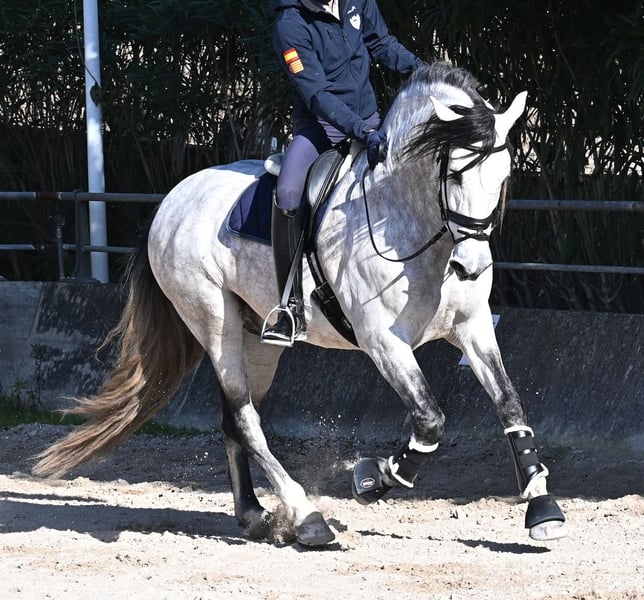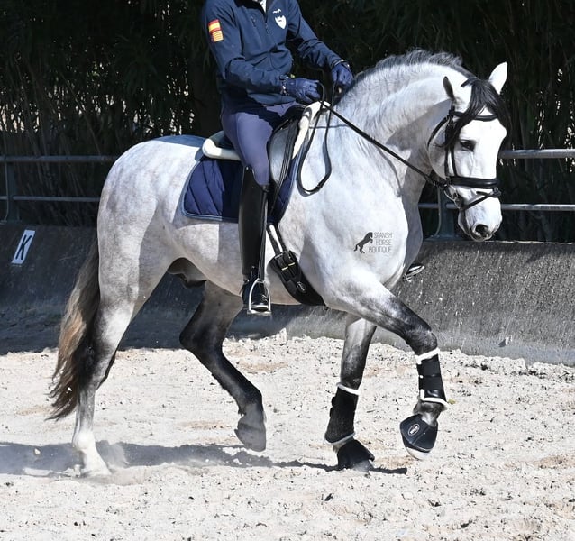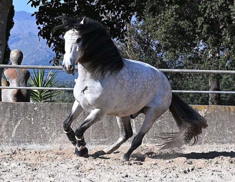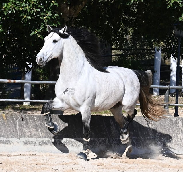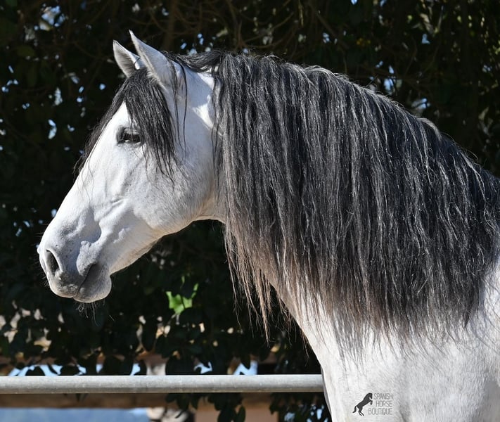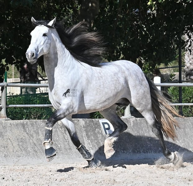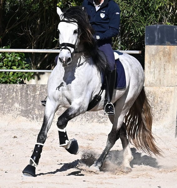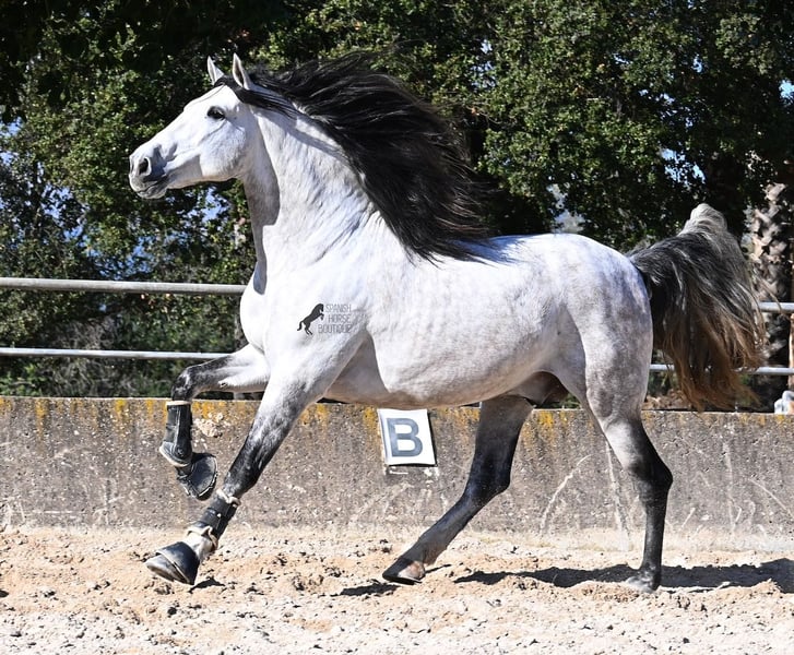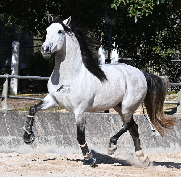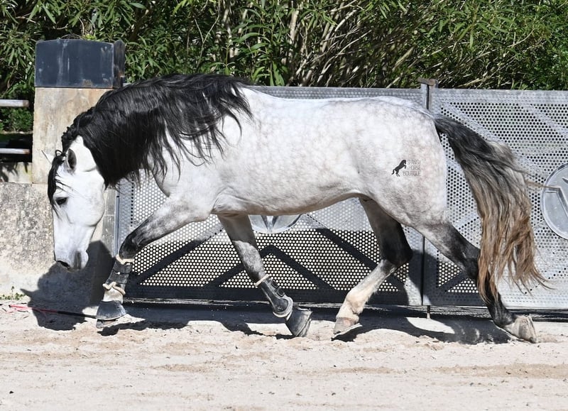 This 2021-born, purebred PRE stallion (Andalusian with registration certificate from ANCCE) is so stunning and majestic that his appearance takes your breath away. Baroque, expressive, with a refined head and gentle eye, impressive movement, and a calm demeanor. He embodies the ideal image of the Spanish horse, which is no surprise, as he comes from one of the world's top breeders, with lineage from PRE bloodlines and is a progeny of the exceptional stallion JUDIO VII. On his sire's side, he is almost entirely BOHORQUEZ-bred—baroque horses known for their friendly nature, willingness to work, and lively movement. His dam's lineage will excite Cartujano enthusiasts: VILAIRE, MARIN GARCIA, and VIUDA DE TERRY dominate. Exclusive breeding selection always pays off, and this stallion demonstrates this perfectly! Standing at 169 cm (16.1 hh) with a proud height, he may even be a few centimeters taller. He could hardly be more baroque, with an impressive neck, strong topline, and croup. What makes him special is that he is not heavy but possesses expansive, flowing movement and is absolutely elastic and flexible. Therefore, he would also be a very interesting candidate for Working Equitation! In handling, he is perfectly obedient and couldn't be more well-behaved. At this breeder’s, all stallions grow up late on large mountain-like pastures in a herd of young horses. They are always well cared for afterward. As a result, they are clear-minded, friendly, social, and robust thanks to their upbringing. Under saddle, he is always attentive, ridden in double-broken bit, and great importance is placed on balancing work and rest phases during his training. After trot and canter, he is brought back to a few rounds at a walk on a long rein, keeping his motivation to work because he can stretch and relax when the lessons are well executed. He performs lateral work in all gaits, can transition from walk to canter, and maintains rhythm in canter when given the reins. He is licensed but has not yet been used for breeding. For those who cannot or do not wish to keep a stallion, castration on-site is of course an option. X-rays were taken in January 2026 and are available for review. A true dream horse with a good character, from a top lineage, and of the highest quality. Price reflects the quality and is very fair! Location: Mallorca. Videos and pedigree available upon request. I am happy to organize a pre-purchase exam, training, castration, transport, or even your journey if you wish to come see him in person. Details can be found on my website or in a personal conversation. Greetings from Spain